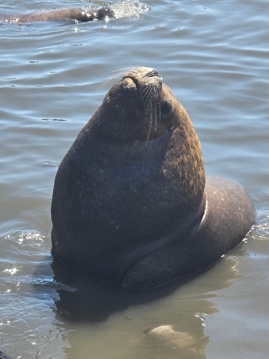 A close-up aerial shot shows the head and neck of a sea lion in water, likely in the city of Iquique, Chile due to their presence there. The sea lion has dark brown fur that appears wet. Its head is a…read more