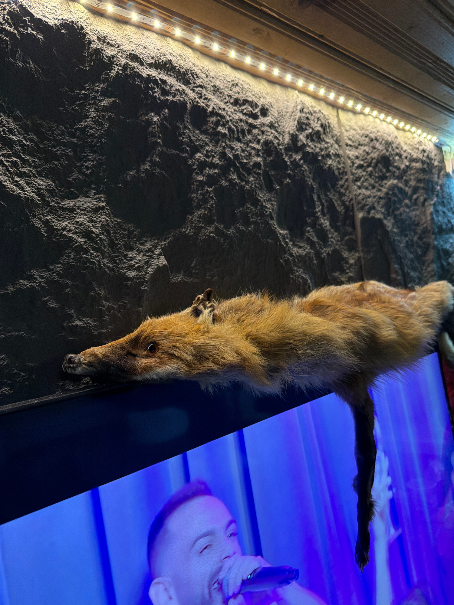 The image shows a taxidermied mammal, likely a European polecat, positioned near a wall with LED lighting and a television screen. The wall has a rough, textured surface. The television screen displayβ¦read more