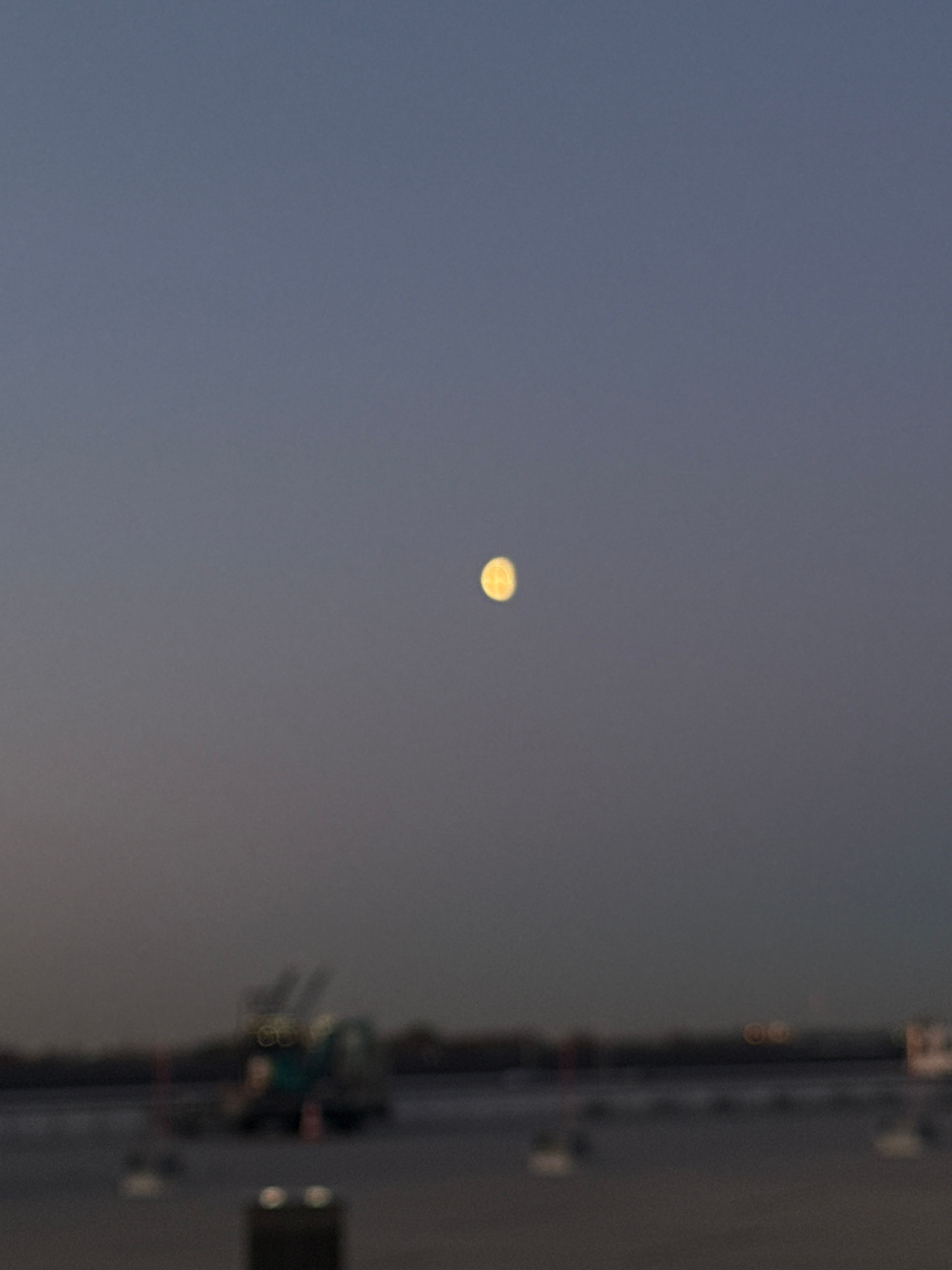 The image shows a blurred scene, likely at dusk, with the sky dominating the left side. A small, blurry yellow circle, possibly the moon or a street lamp, is visible in the upper center. On the right,…read more