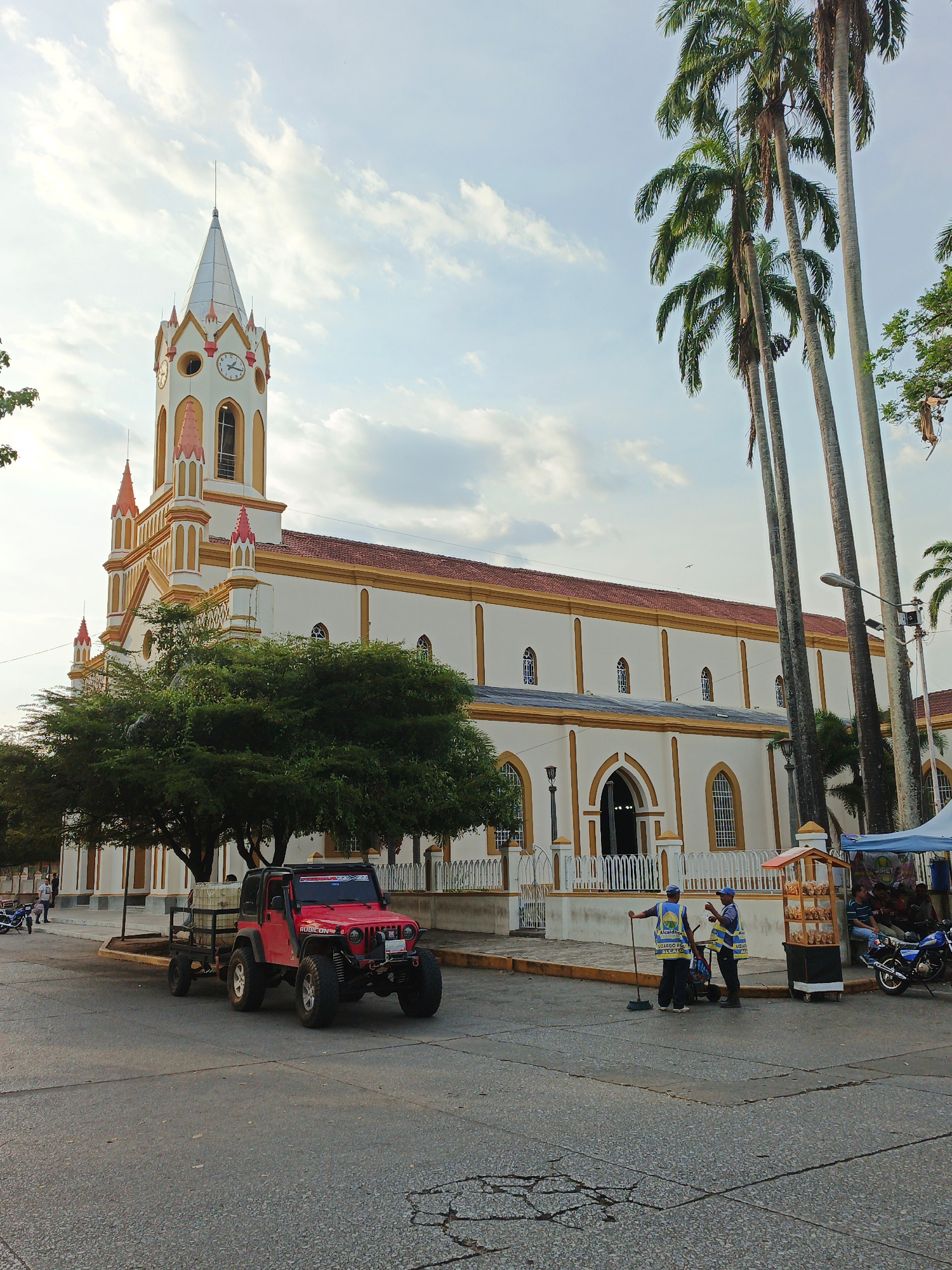 The image shows the Iglesia Inmaculada Concepción in Tinaquillo, Venezuela. A red Jeep with a trailer is parked on the street in front of the church. Two sanitation workers in blue vests are standing…read more