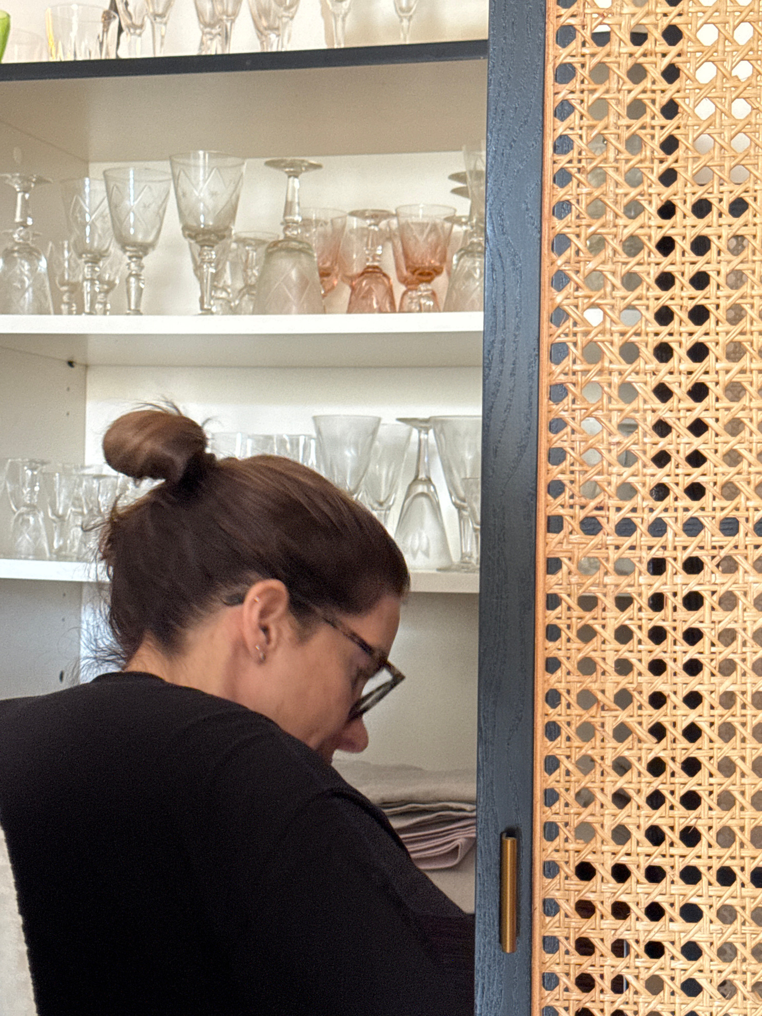 A photograph taken indoors shows a woman, viewed from the side, bending towards a cabinet. The cabinet has white shelves filled with clear and pink glassware. A drawer sits above, featuring a woven ca…read more