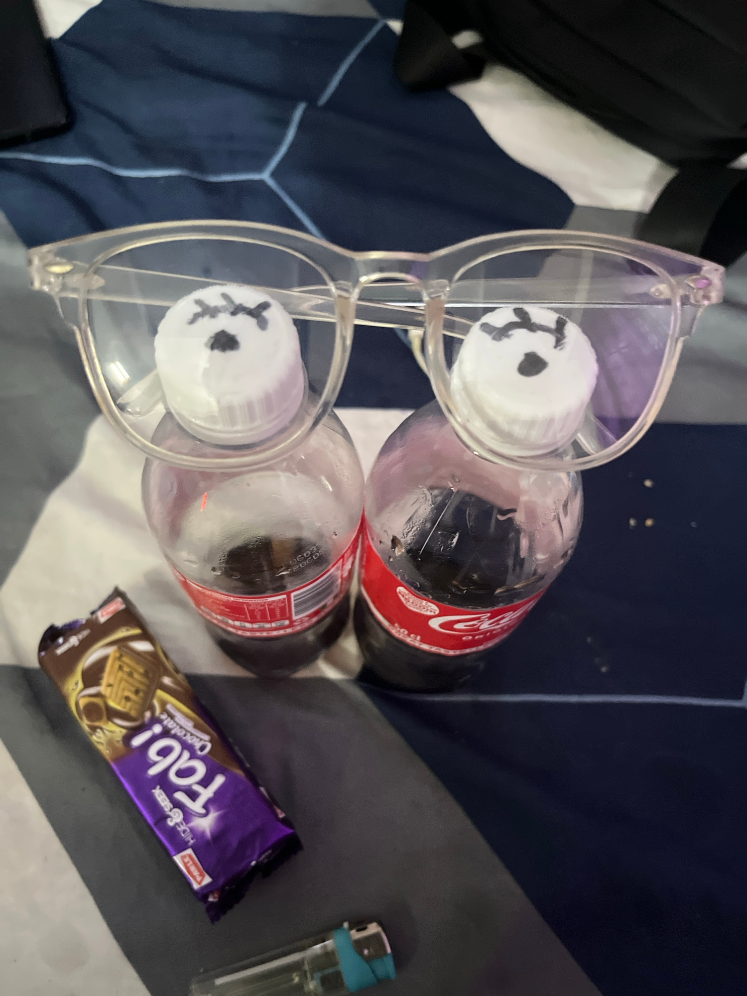 The image depicts two Coca-Cola bottles lying on a bed with a white and blue patterned sheet. The bottles are partially obscured by a pair of transparent eyeglasses. The caps of the bottles have drawi…read more