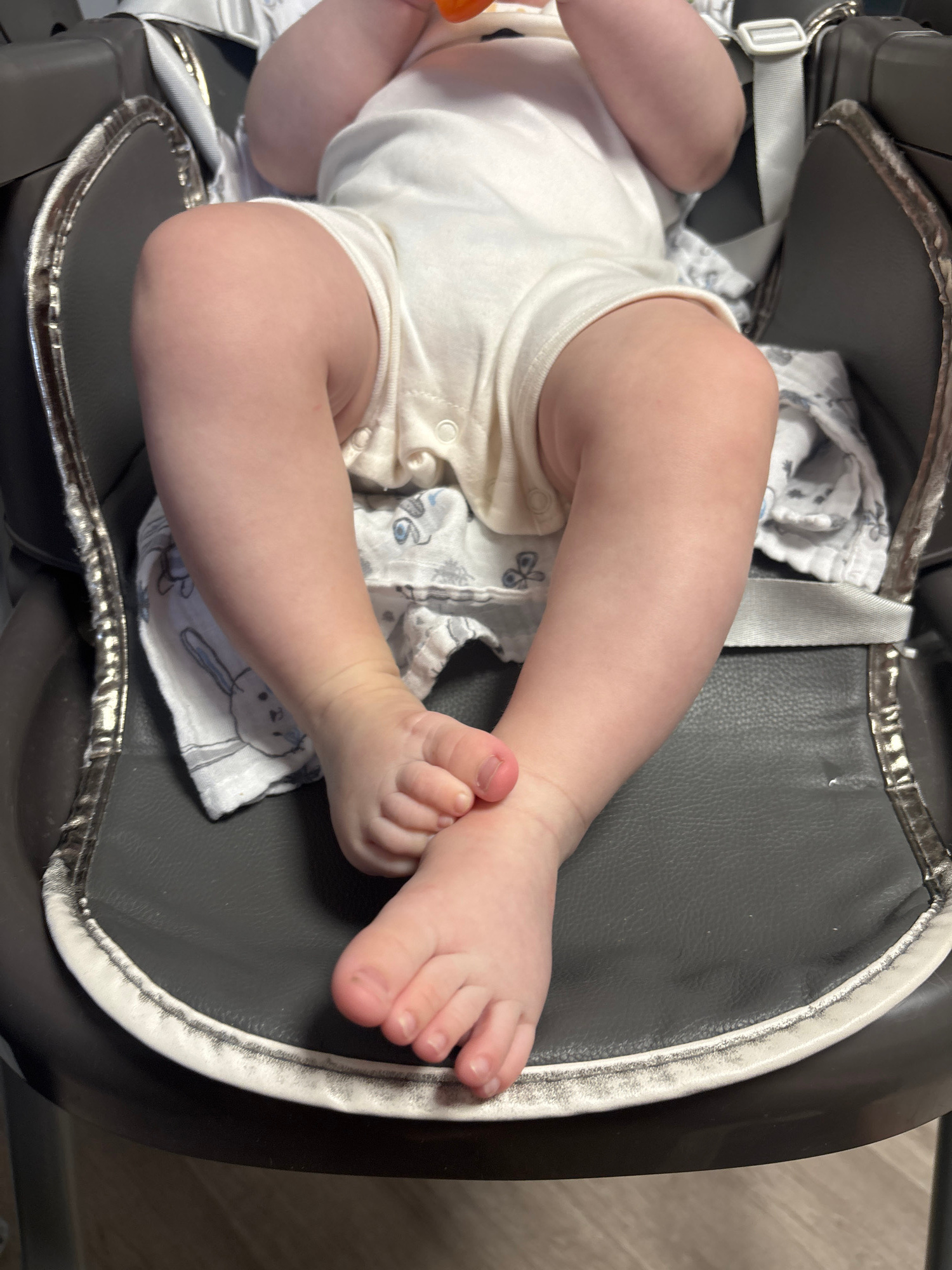 The image shows a baby lying in a gray high chair. The baby is wearing a white onesie with a patterned swaddle cloth. The high chair has a silver trim. The background appears to be a room with wood fl…read more