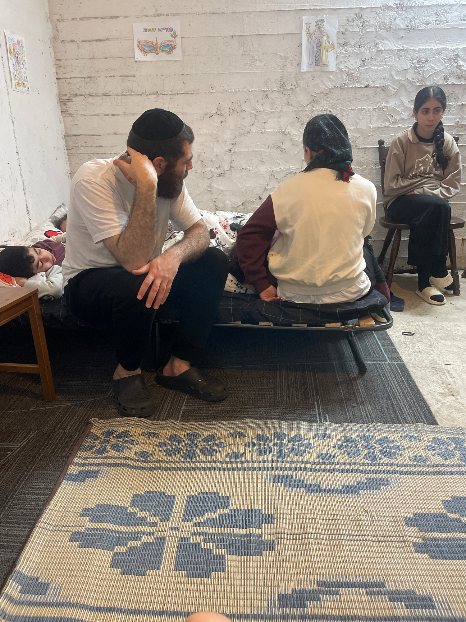 This image depicts an indoor scene in Petah Tikva, Israel. The room features roughly textured, off-white walls displaying horizontal striations, with sections showing wear and discoloration. Three pie…read more