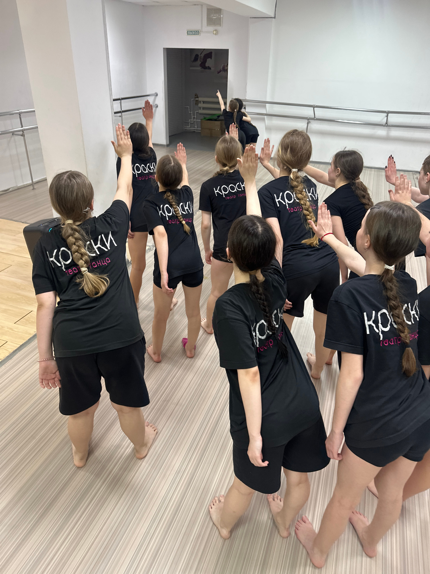 A group of young people in black t-shirts are practicing a dance or exercise routine in a studio. The studio appears to be in Votkinsk, Russia based on the text on their shirts. They are lined up in r…read more