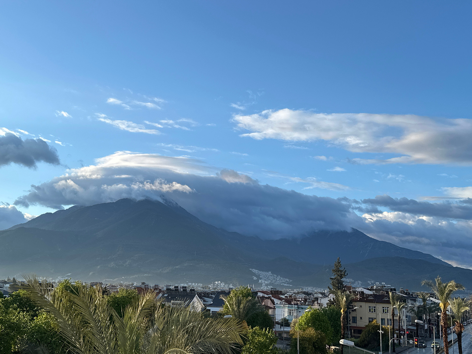 The image captures a scenic view of Fethiye, Turkey, with a prominent mountain range partially obscured by clouds in the background. The city lies in the foreground, featuring a mix of residential and…read more