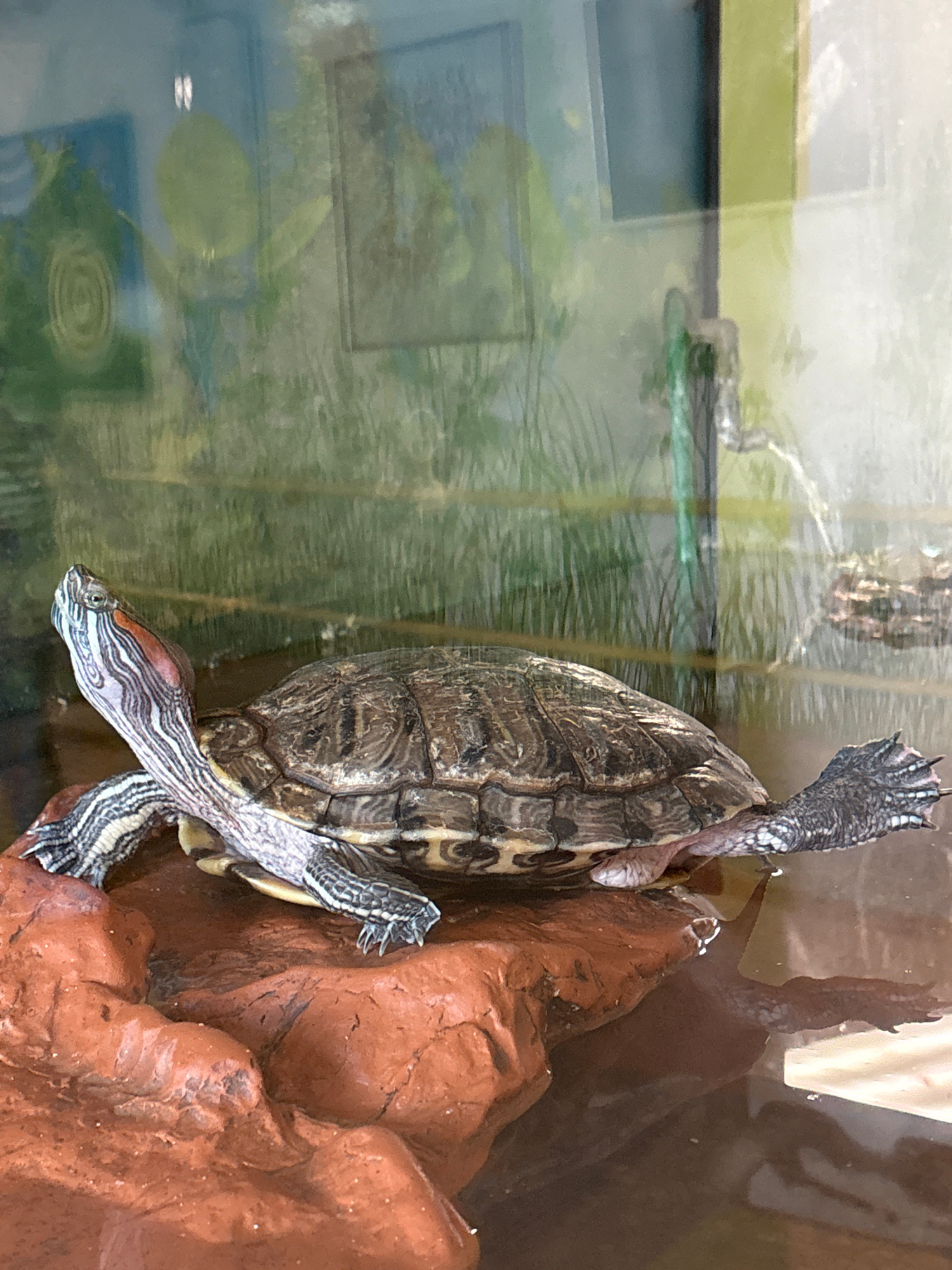 A Red-eared slider turtle is captured in an indoor aquarium setting, partially submerged in water and resting on a reddish-brown, textured rock formation. The turtle is oriented diagonally across the…read more