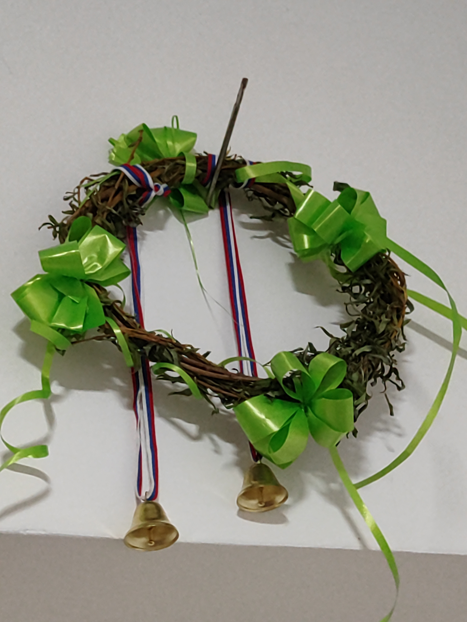 A festive wreath hangs on a plain, light-colored wall. The wreath is crafted from intertwined brown twigs and what appear to be dried, dark green leaves. It is generously decorated with multiple brigh…read more