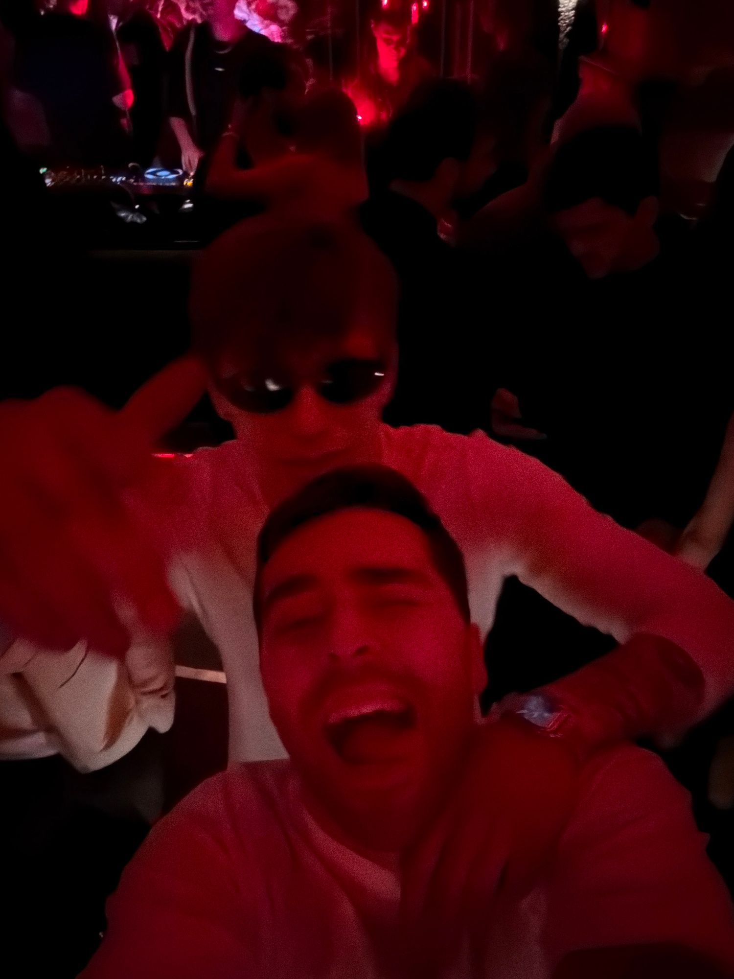 Two individuals pose for a selfie in a dimly lit environment, seemingly at a club or venue. The man on the right is smiling broadly with an open mouth. The person on the left is wearing sunglasses. Thβ¦read more