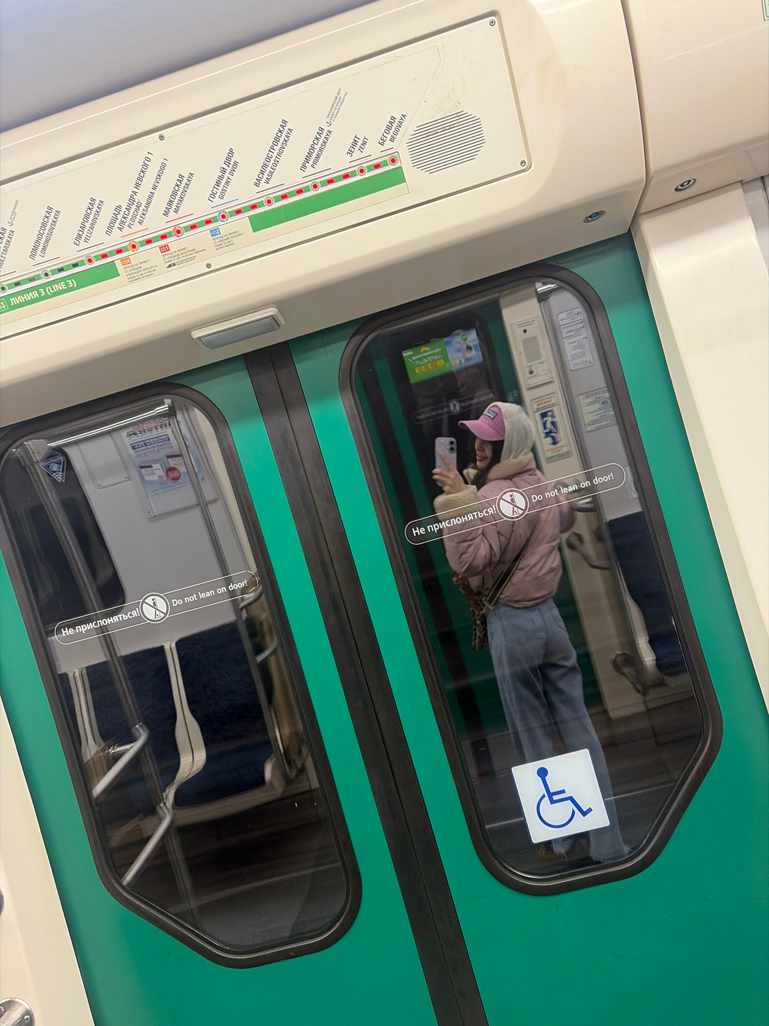 The image depicts the interior of a subway car in Saint Petersburg, Russia. It's taken from an angle, showing a segment of the car's wall with a train line map and two windows. The train line map indβ¦read more