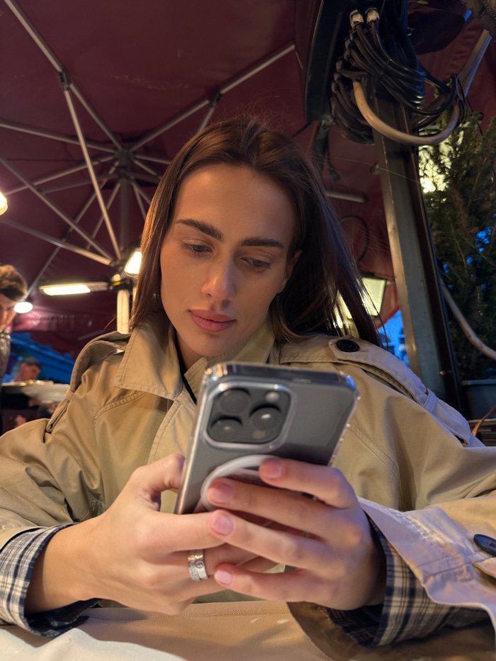 A young adult female is depicted from the chest up, seated at a table in an outdoor or semi-outdoor restaurant setting in Venice, Italy. She has long, dark brown hair and is wearing a light tan trench…read more