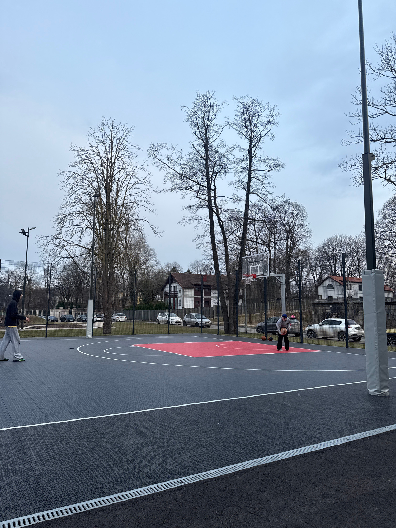 The image depicts an outdoor basketball court located in Riga, Latvia. The court has a dark grey playing surface with red painted key areas, and white lines marking the boundaries and free-throw circl…read more