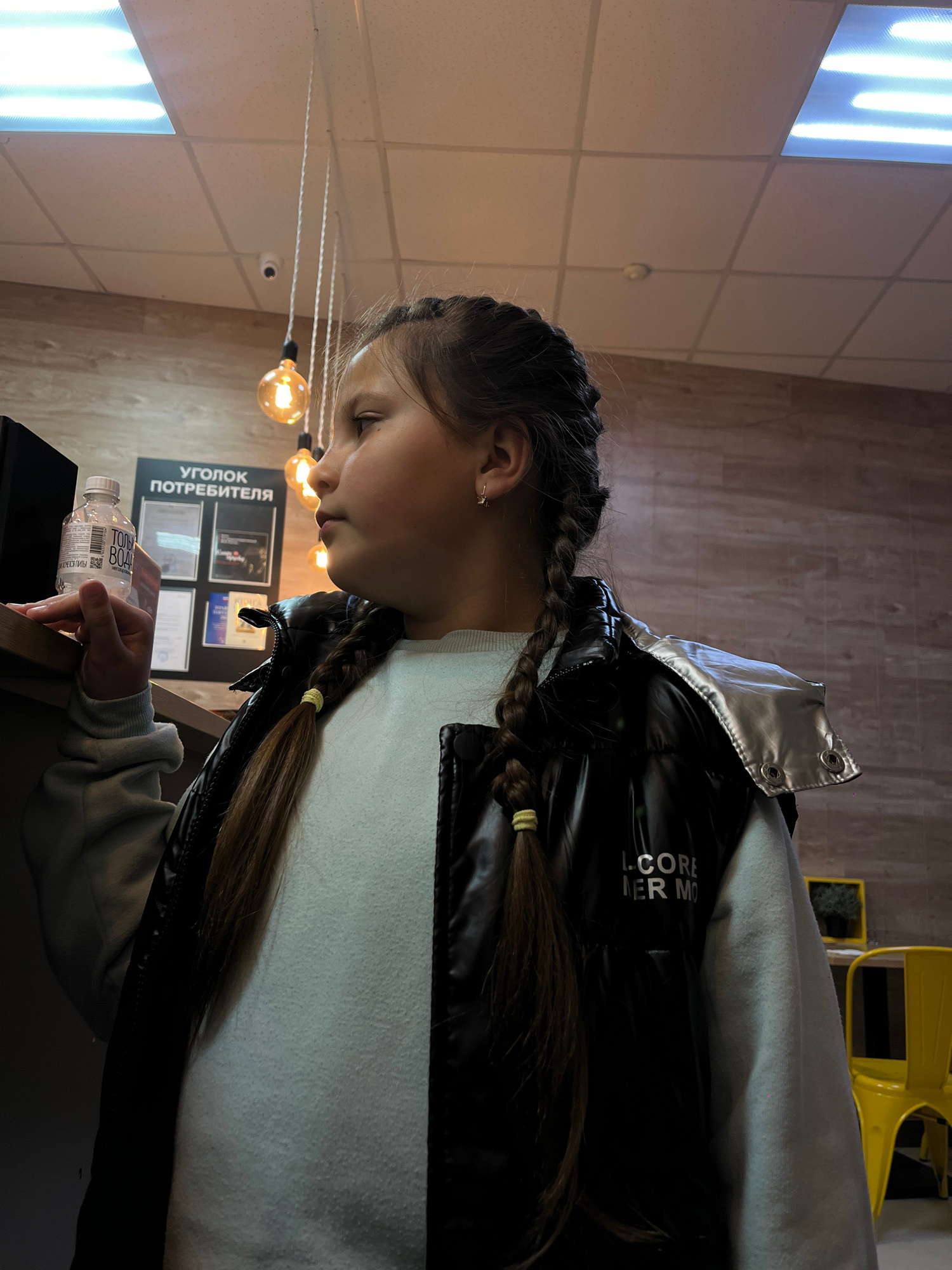 A young girl, likely a pre-teen or early teen, is the central subject of this indoor, sideways-oriented photograph taken in Novopokrovskaya, Russia. She is shown in profile, looking downwards with a neutral expression, holding a clear plastic water bottle in her right hand. Her hair is styled in two braids, secured with yellow elastics, and she is wearing a light-colored long-sleeved top beneath a black puffer vest with a shiny silver collar. The vest has partially visible text that reads "L. CORE" and "MER MO". The setting appears to be a commercial or public indoor space, possibly a cafe or shop. In the background, a sign is prominently displayed on the wall, reading "УГОЛОК ПОТРЕБИТЕЛЯ" (Consumer's Corner), with several documents or certificates arranged beneath it. Various light sources illuminate the scene, including bright overhead fluorescent panels and a cluster of hanging Edison-style bulbs. A small security camera is visible on the ceiling. In the far background, part of a yellow chair can be seen, along with what appears to be a plant in a dark pot. The walls feature a tiled pattern, and a wooden texture is visible, possibly on the floor or another wall. The water bottle in the girl's hand has a label that clearly shows "ТОНУС ВОДА" (TONUS VODA) and "НЕГАЗИРОВАННАЯ" (non-carbonated). | Open Wire