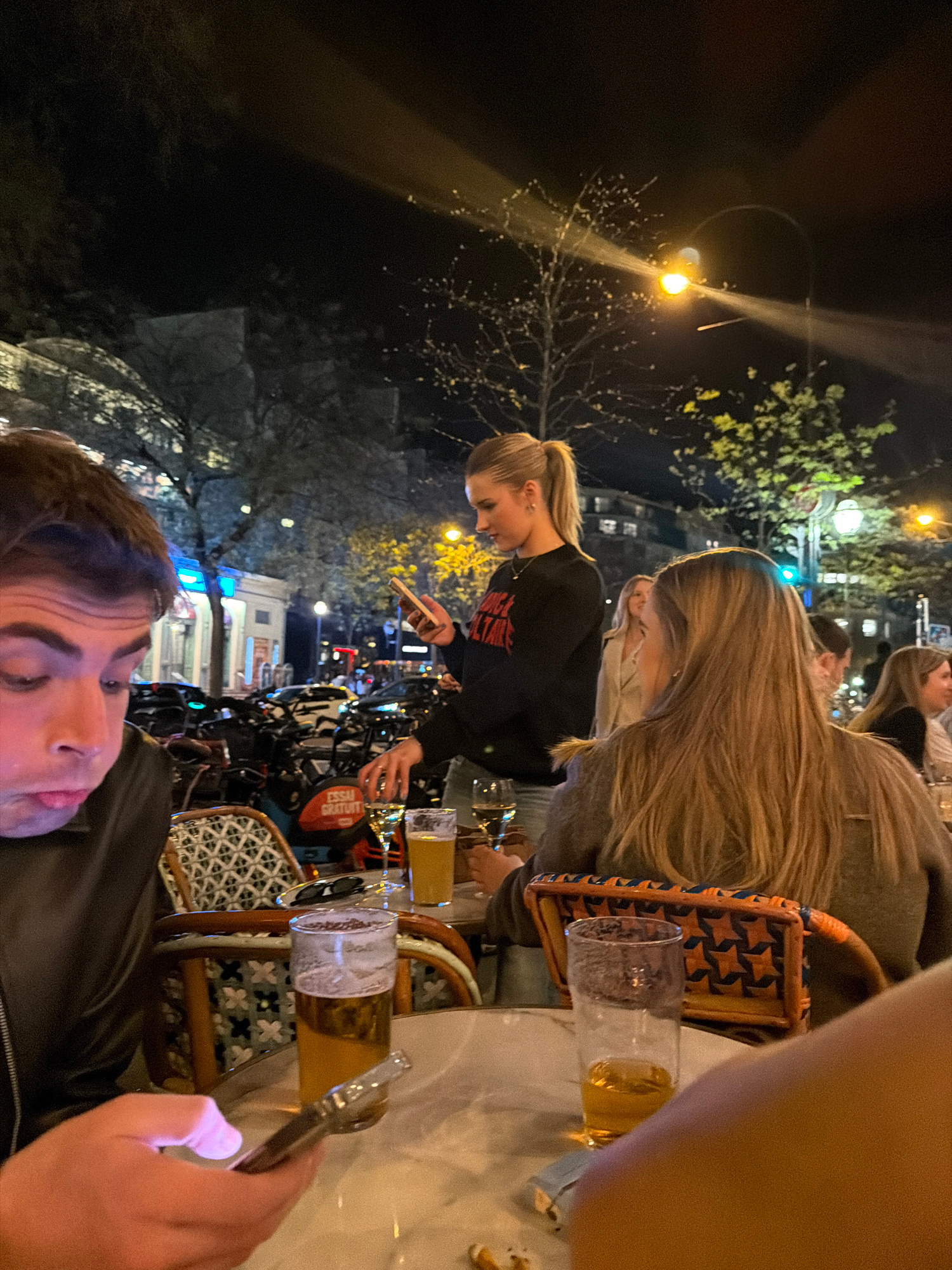 The image captures a scene at an outdoor café in Paris, France, likely during the evening. Several people are seated around a table, with glasses of beer and personal belongings visible. A woman with…read more