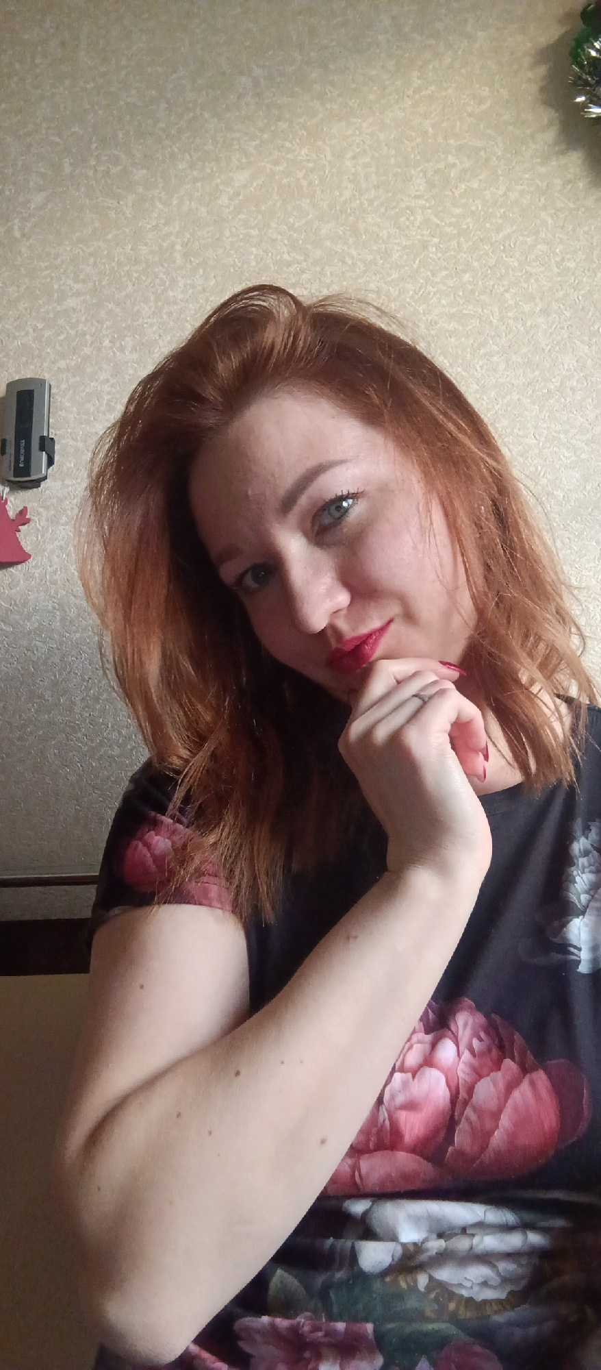 A woman with auburn hair, light skin, and red lipstick is posing indoors, resting her chin on her hand. She is wearing a floral print top with large pink flowers. A telephone or intercom system is aff…read more