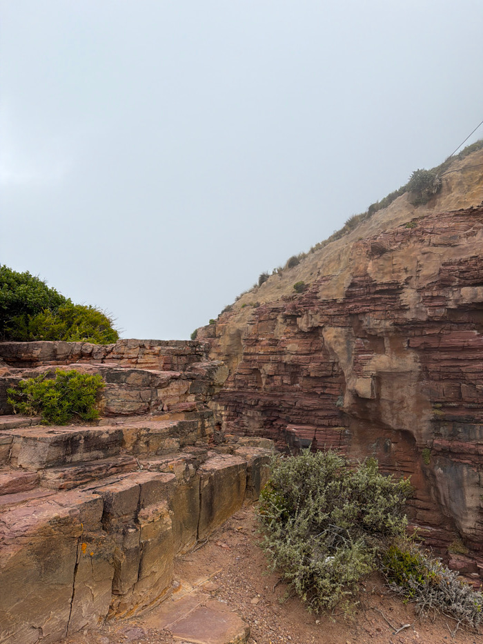 The image displays a rugged coastal landscape near Cape Town, South Africa, under an overcast sky. The foreground and left midground feature stepped, horizontally stratified rock formations in reddish…read more