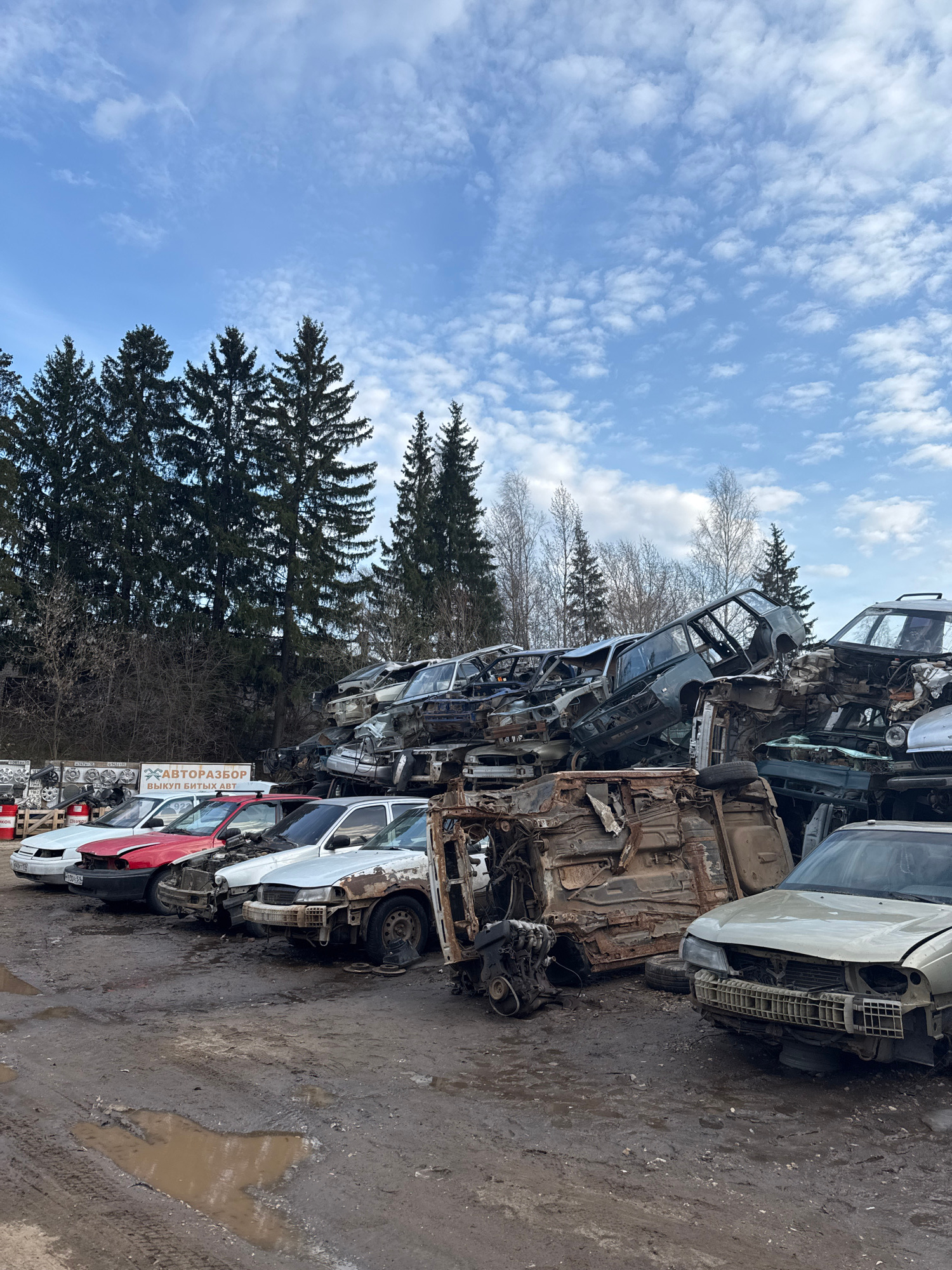 This image depicts an outdoor car scrapyard or auto salvage yard, likely located in Chaikovsky, Russia, under a bright, partly cloudy sky. The scene is filled with a large collection of dismantled and…read more