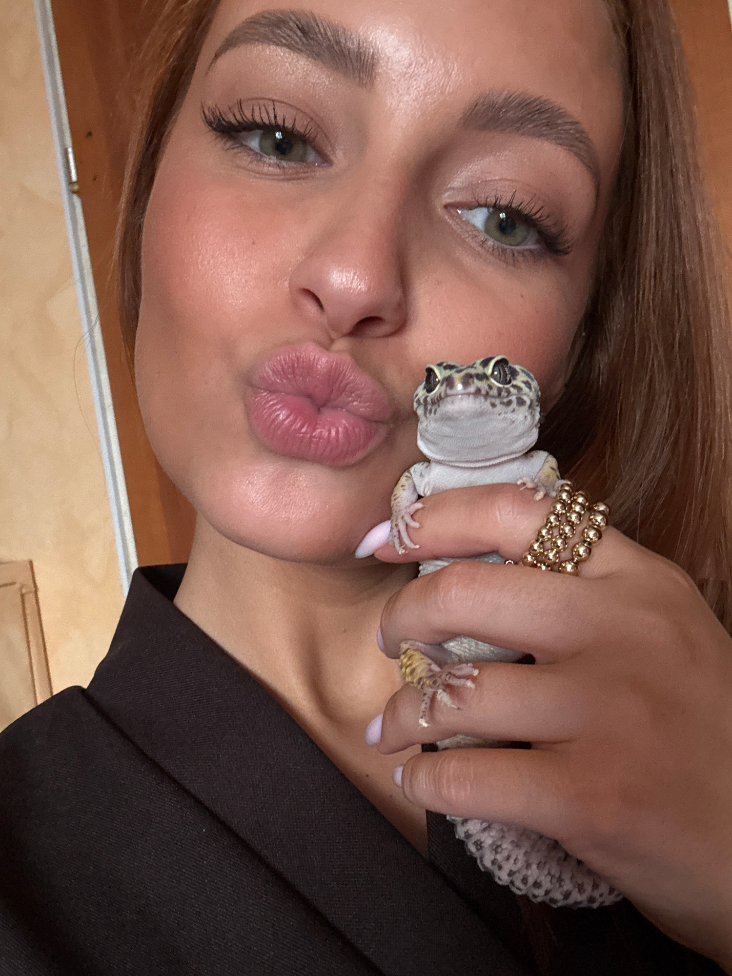 A light-skinned woman with brown hair and green eyes poses with a leopard gecko perched on her hand. She has a puckered expression. She is wearing a black top, and has gold rings on her hand. The back…read more