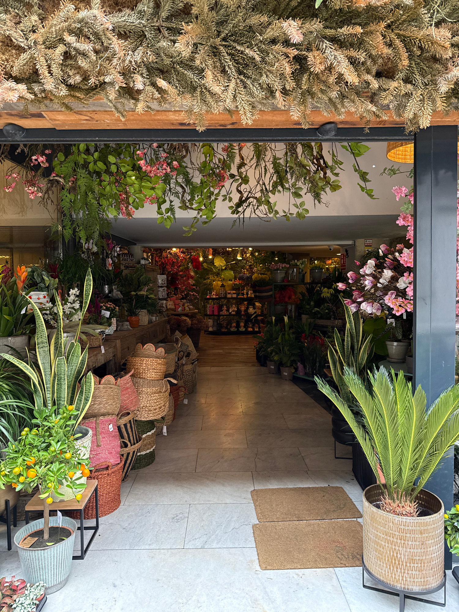The image depicts the entrance of a flower shop in Oviedo/uviéu, Spain. The entrance is framed by greenery, including dried branches on the left and various plants and flowers on both sides. Inside th…read more
