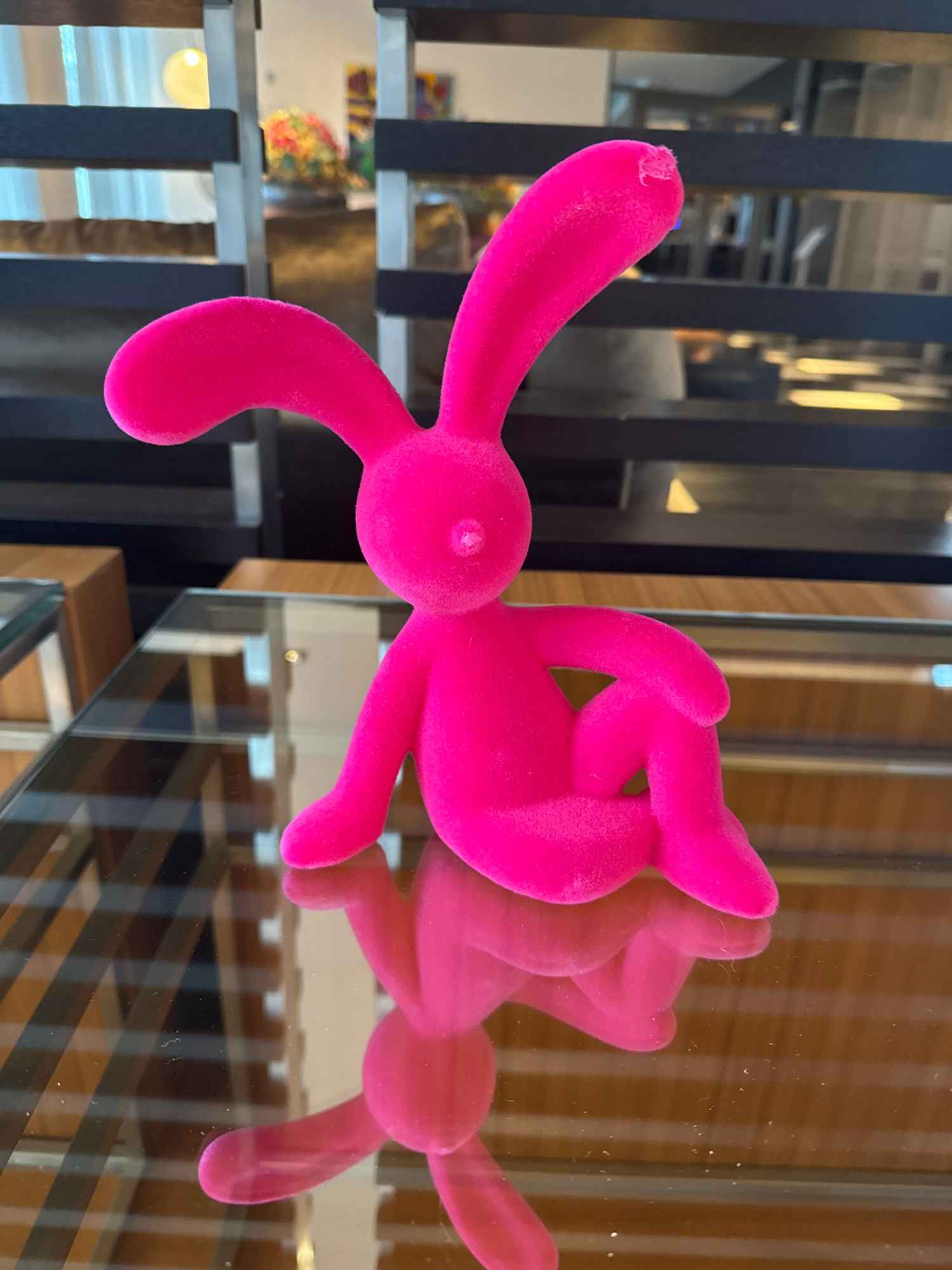 A hot pink, plush, stuffed rabbit with long, rounded ears and a circular body lies on a reflective glass surface. The reflection of the rabbit is visible on the glass. Behind the rabbit, a black and t…read more