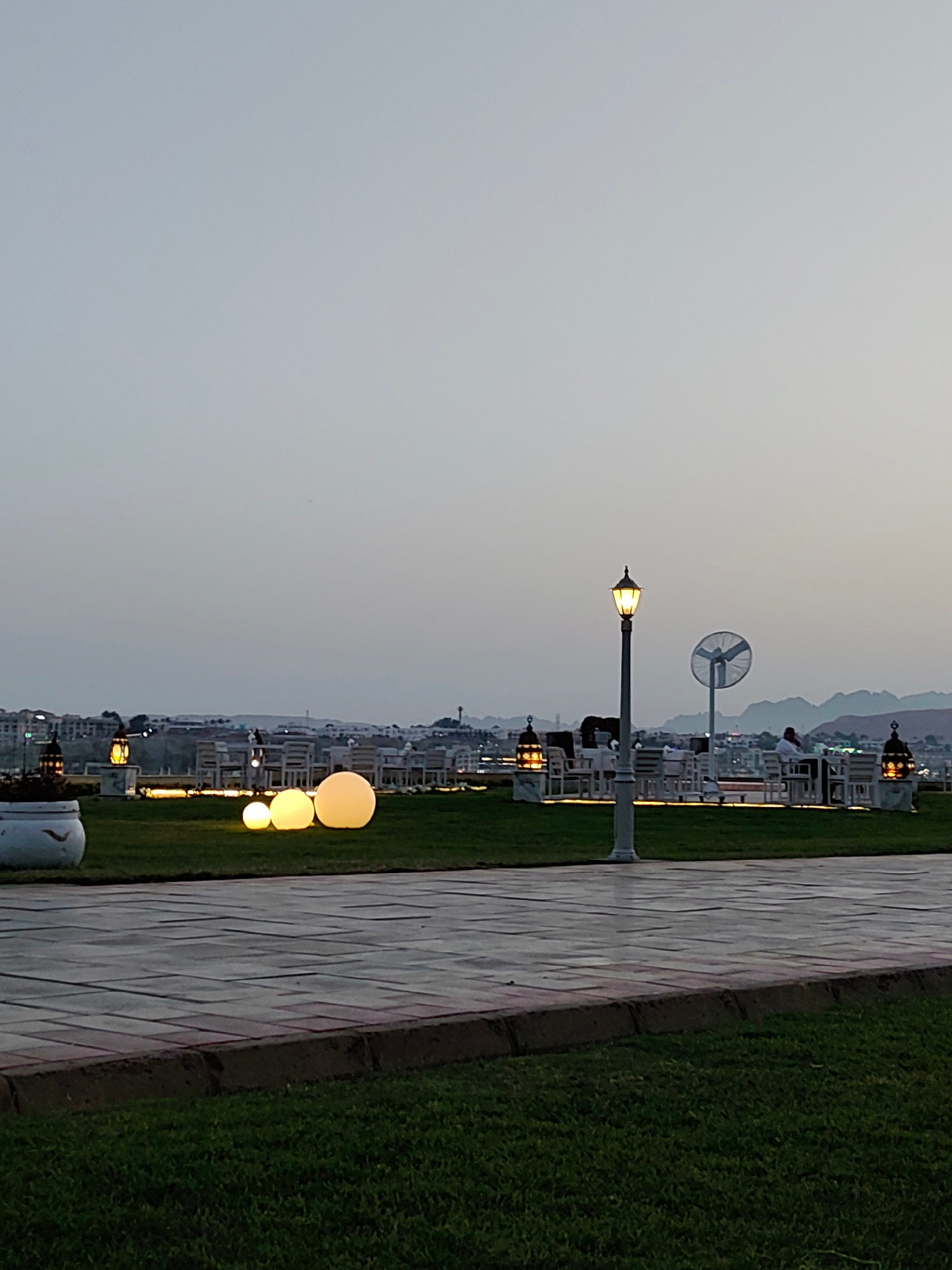 The image depicts an outdoor evening scene at what appears to be a resort or restaurant patio in Sharm El Sheikh, Egypt. The time of day is dusk or early evening, evidenced by the muted blue-gray sky,…read more