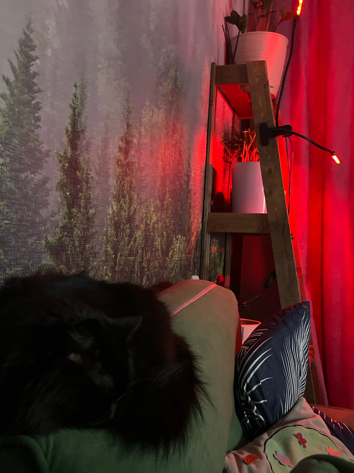 The image captures an indoor scene, likely a living space or bedroom, in Chaikovsky, Russia, dominated by a strong red light. The main subject is a fluffy black cat, resting comfortably on a green-bro…read more