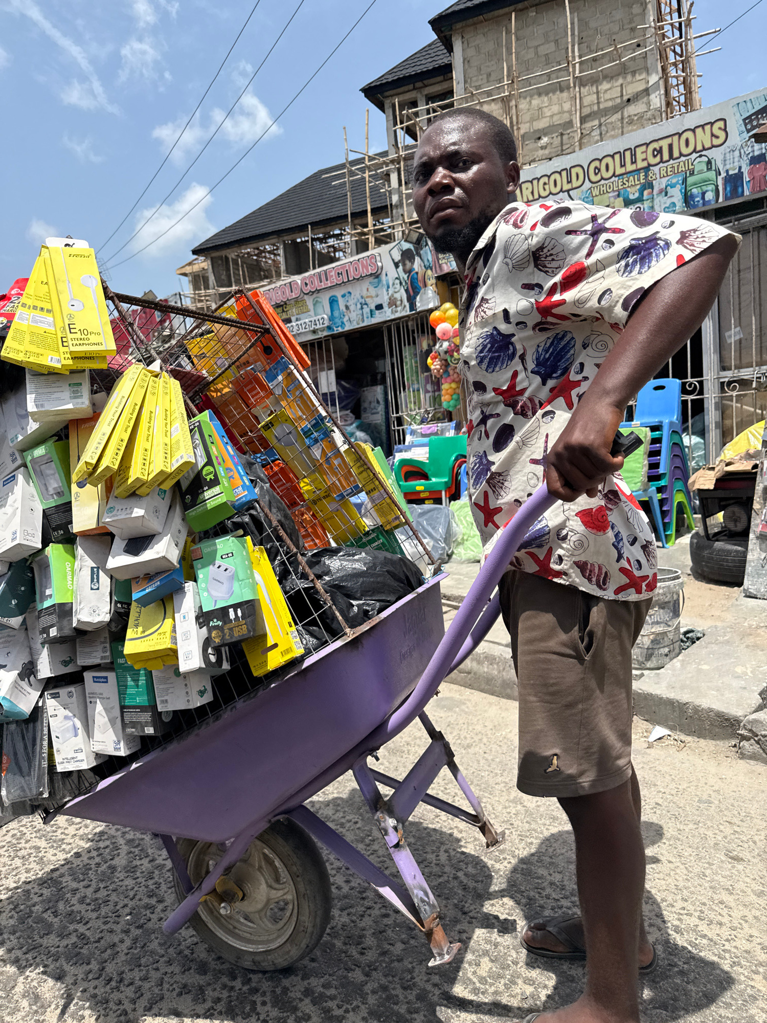 A man stands on a concrete sidewalk next to a purple wheelbarrow, its metal frame overfilled with packages of merchandise including earbuds and chargers, in Ado, Nigeria. The man wears a shirt pattern…read more