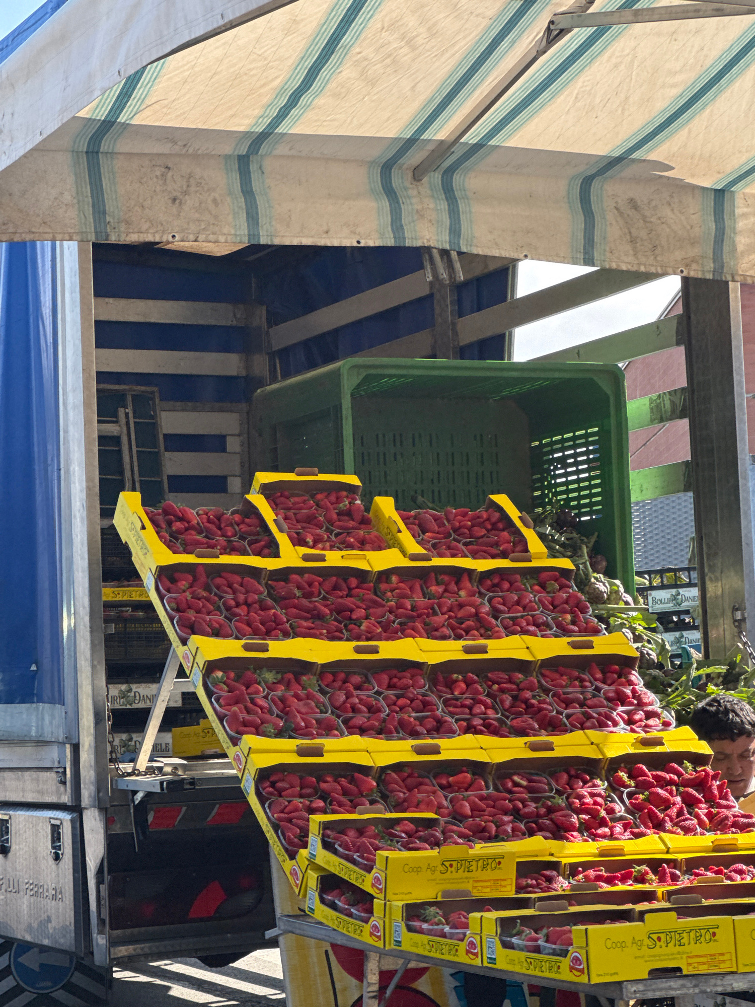 Here is a detailed description of the image: The image appears to be taken at a market stall in Nettuno, Italy, given the Italian text and the overall atmosphere. The orientation of the image is rota…read more