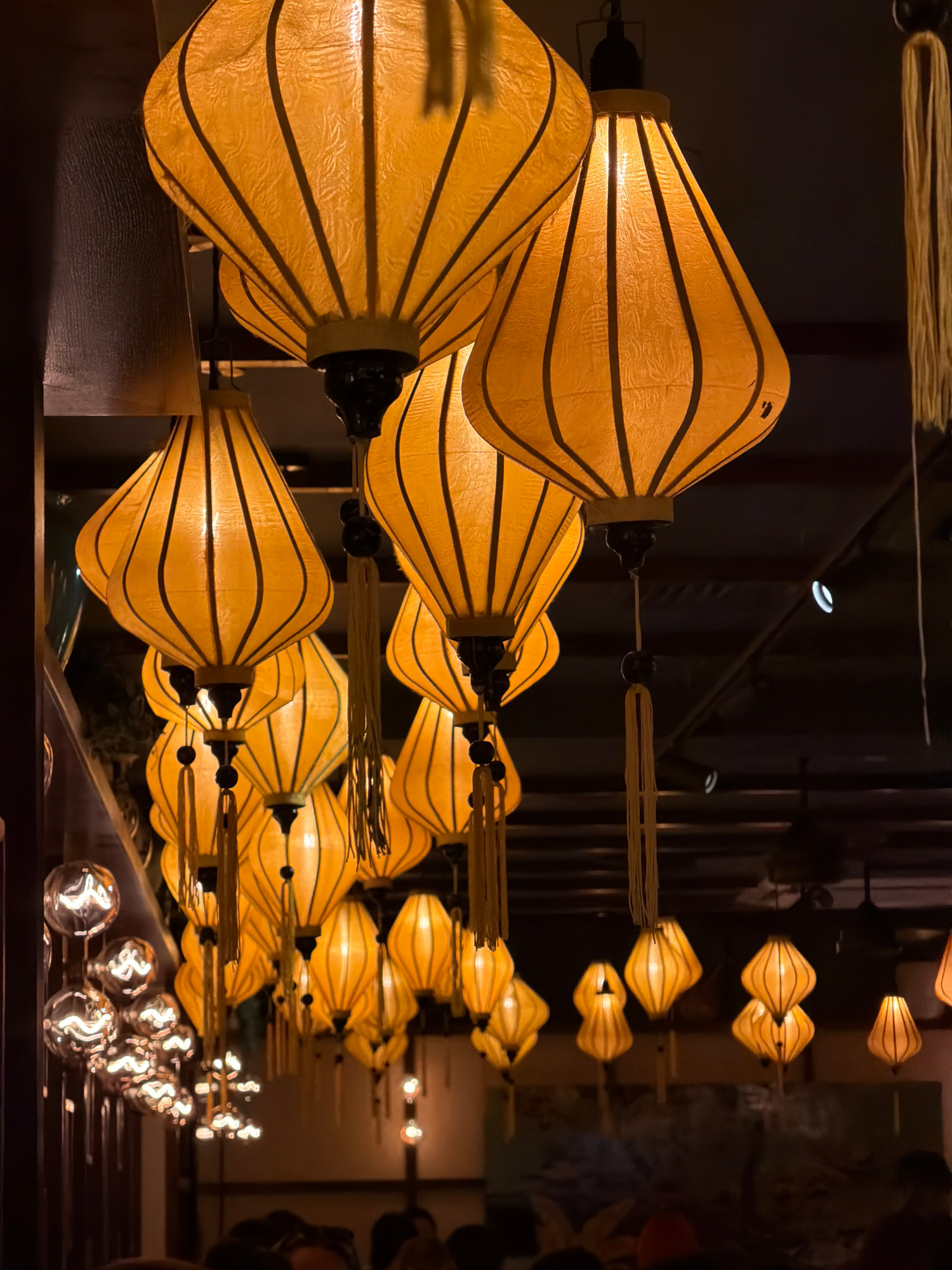 A low-angle shot depicts a row of illuminated golden lanterns with dark brown stripes hanging from the ceiling, casting a warm light. Some silver spherical ornaments are below the lanterns. The locati…read more