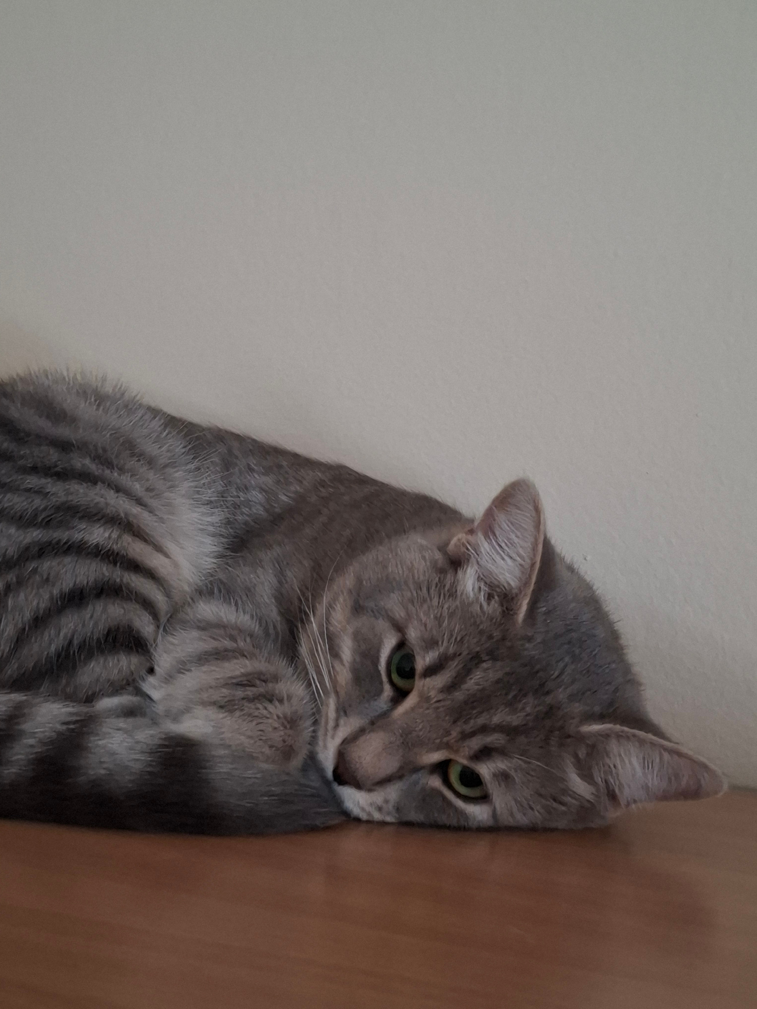 A gray tabby cat is positioned between a light beige wall and a brown wooden surface, possibly a doorframe. The cat is facing towards the right and downwards, with its paw curled up near its face. Theβ¦read more