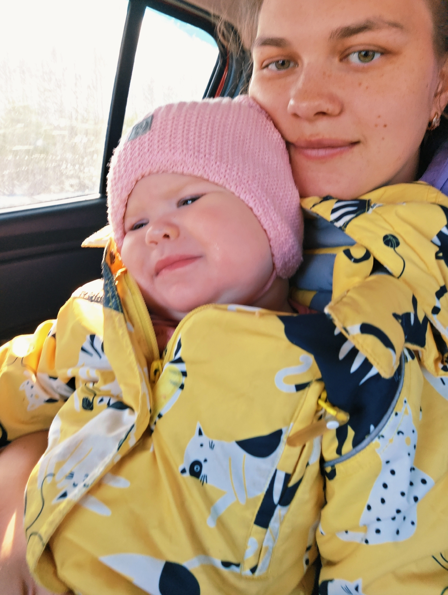 A mother and her baby are in a car. The baby is wearing a pink hat and a yellow jacket with cat patterns. The mother has freckles and is wearing a yellow jacket. They are likely in Unknown, Russia, th…read more