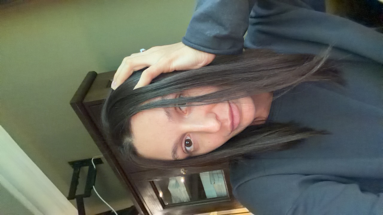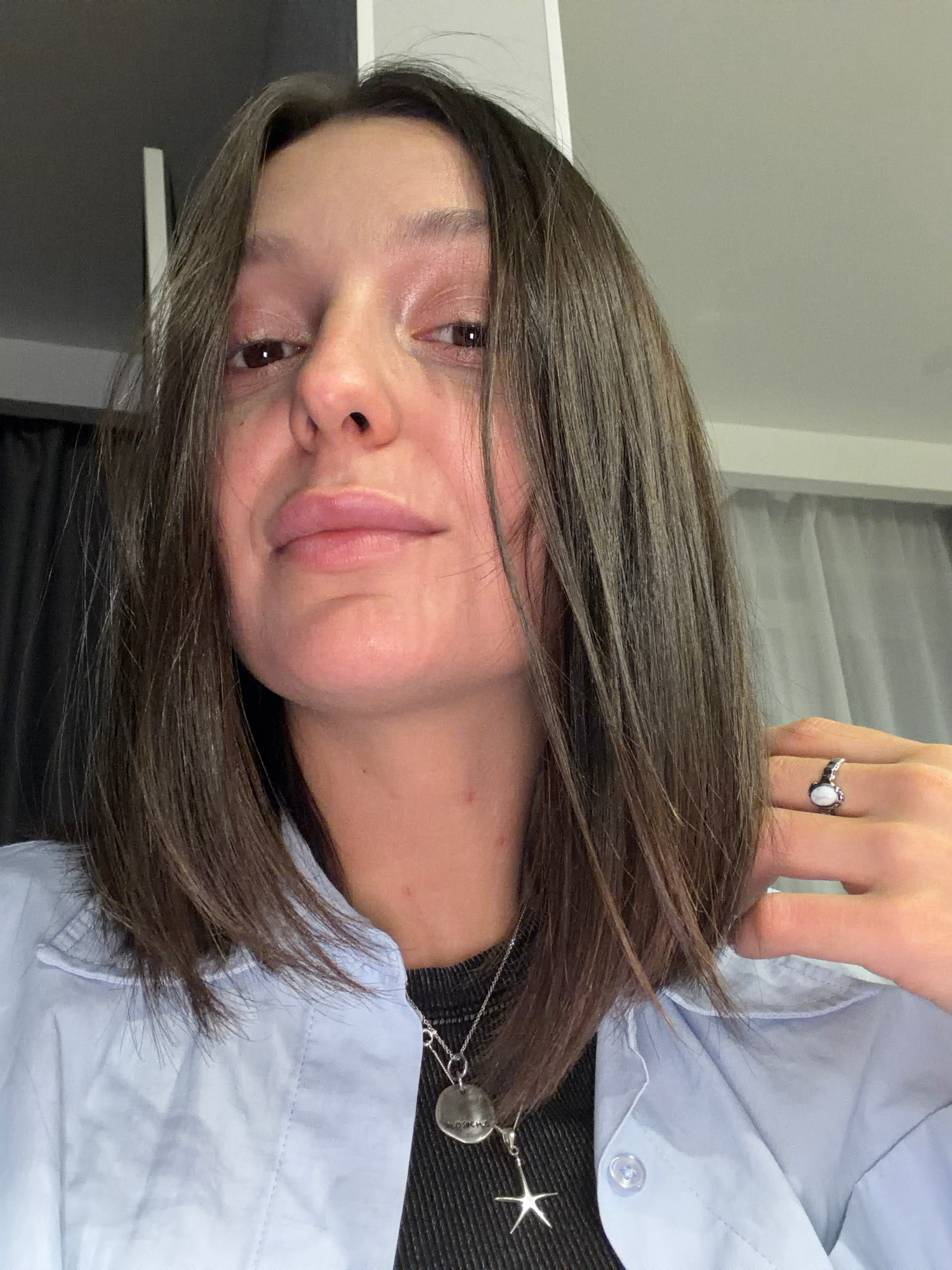 A woman with brown hair is shown in a close-up, angled shot. She is wearing a light blue button-down shirt over a black top, and a silver necklace with a star-shaped pendant is visible around her neck…read more