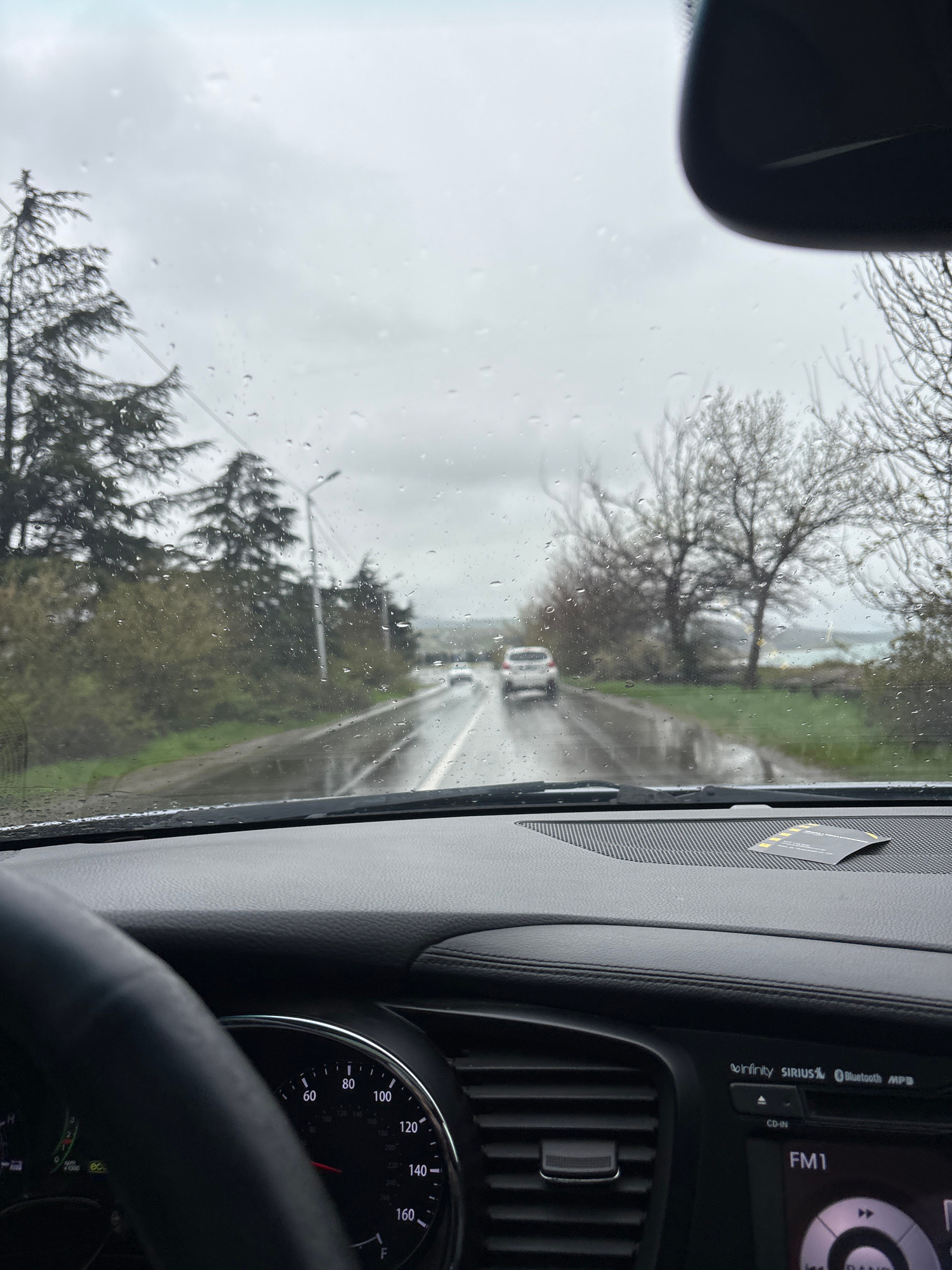The image appears to be taken from inside a car, looking out through the windshield at a rainy day. The car is moving on a road with other vehicles visible in the distance. Trees line the side of the…read more