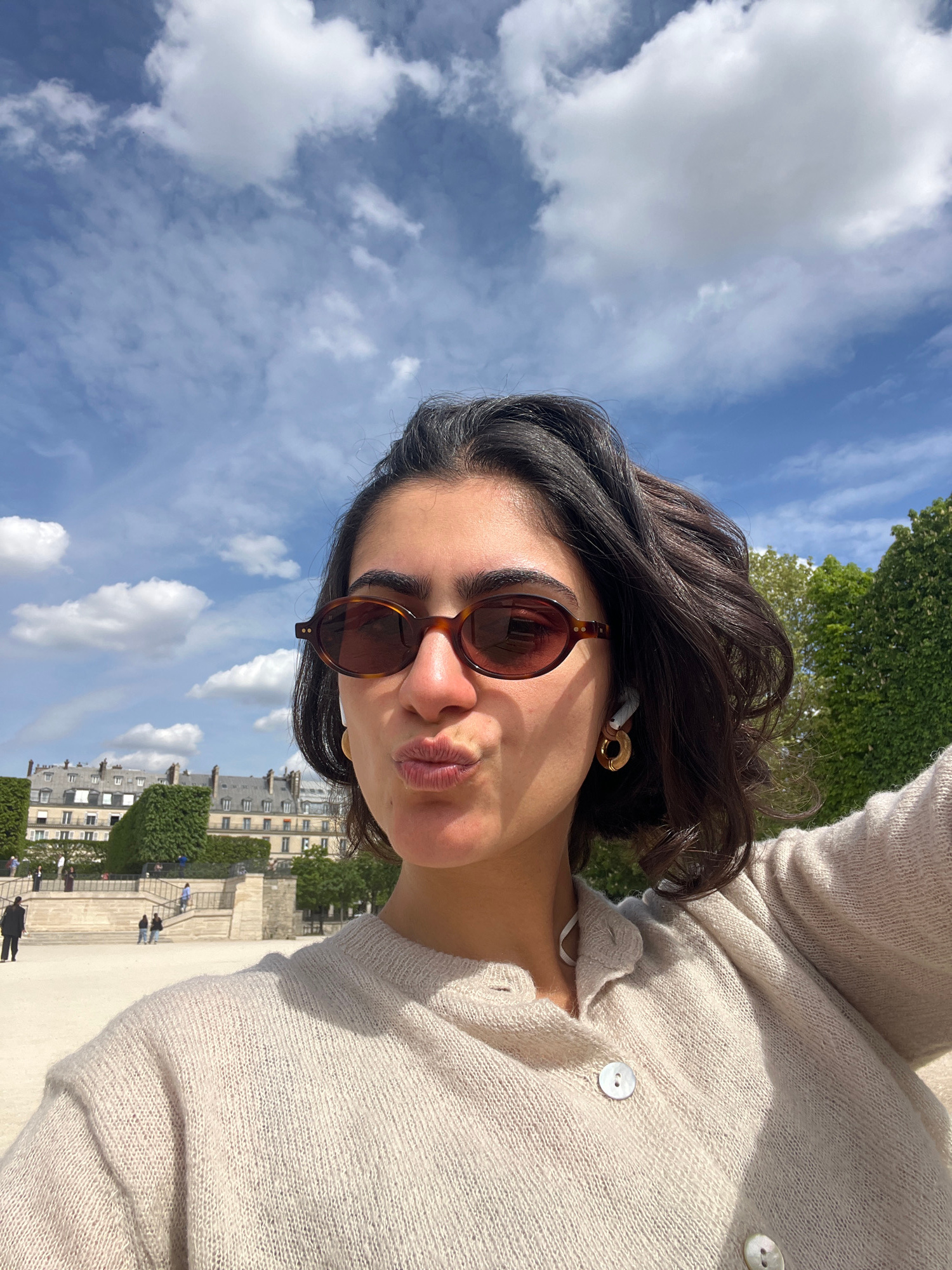 A bright, outdoor selfie captures a young woman in Paris, France, under a clear blue sky with scattered white clouds. The woman, with dark, wavy hair, is in the foreground, wearing tortoiseshell-frame…read more
