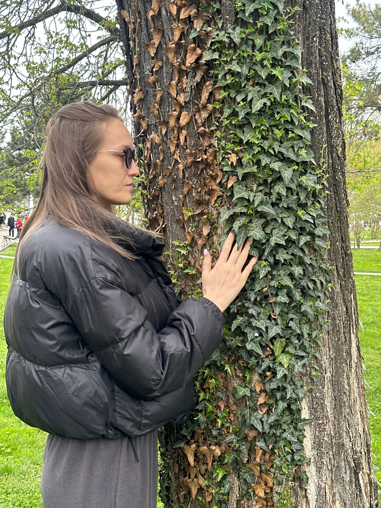 A woman in a black puffer jacket and sunglasses stands next to a tree trunk covered in ivy. The tree is partially covered in brown, dried leaves. The woman has her right hand touching the ivy. The bac…read more