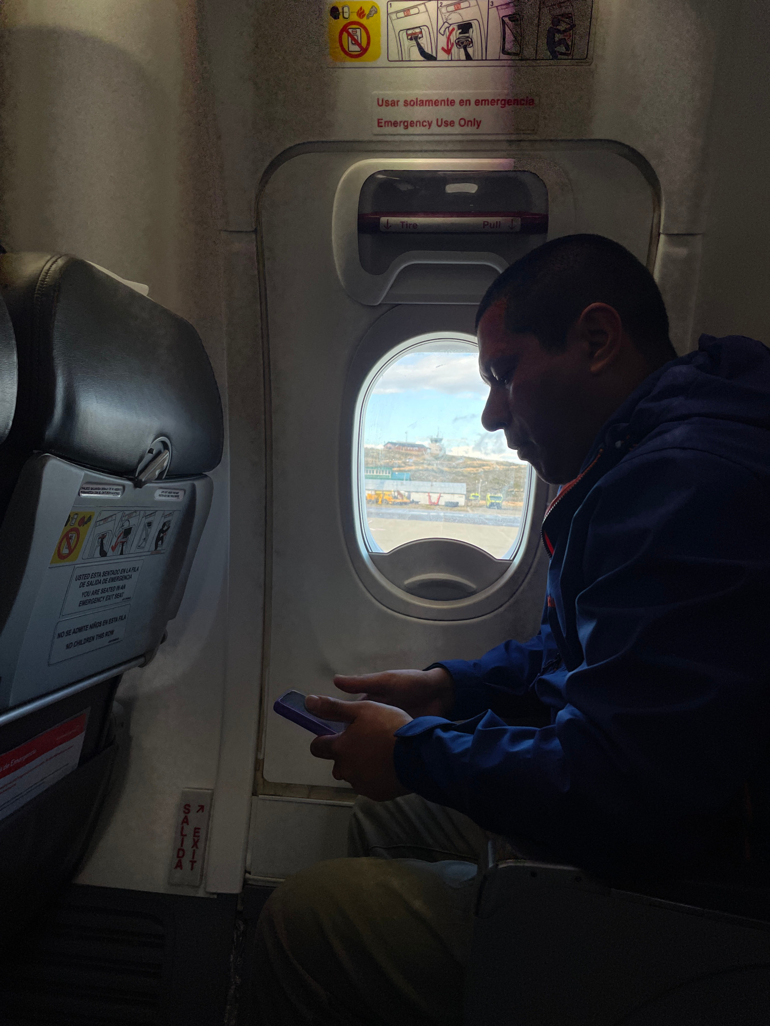 The image captures an airplane interior, likely at an airport in Ushuaia, Argentina, viewed from a slightly low angle across an aisle. A person wearing a dark blue jacket leans forward, looking out a…read more