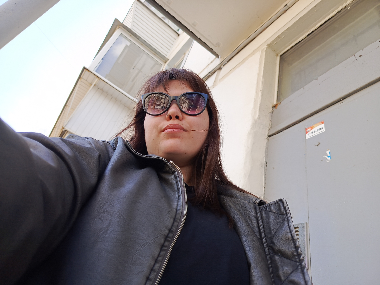A low-angle selfie captures a young person, likely female, with medium-length dark brown hair and bangs, wearing black-framed sunglasses with reflective pinkish-purple lenses. A nose piercing is visib…read more