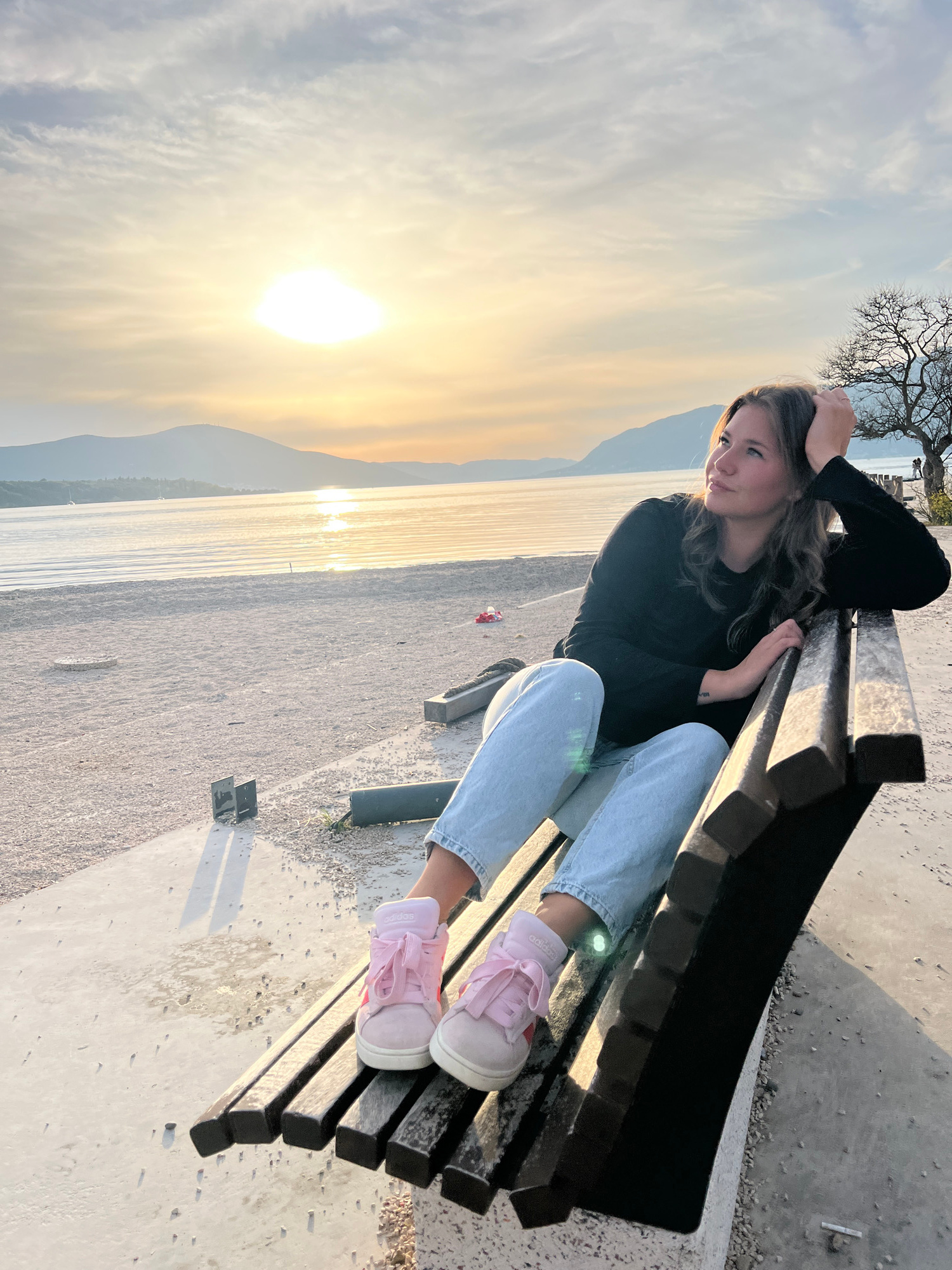 A woman is sitting on a park bench in Tivat, Montenegro. The bench is dark, likely wood or a dark-colored metal, and has multiple slats. The woman is wearing a long-sleeved black shirt, light blue jea…read more