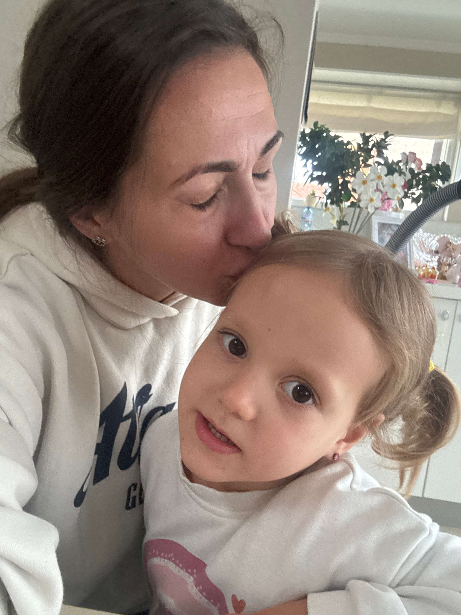 A photo shows a woman and a young girl lying down in what appears to be a home setting. The woman, with dark hair and closed eyes, is positioned on her side. The girl, with light brown hair tied in a…read more