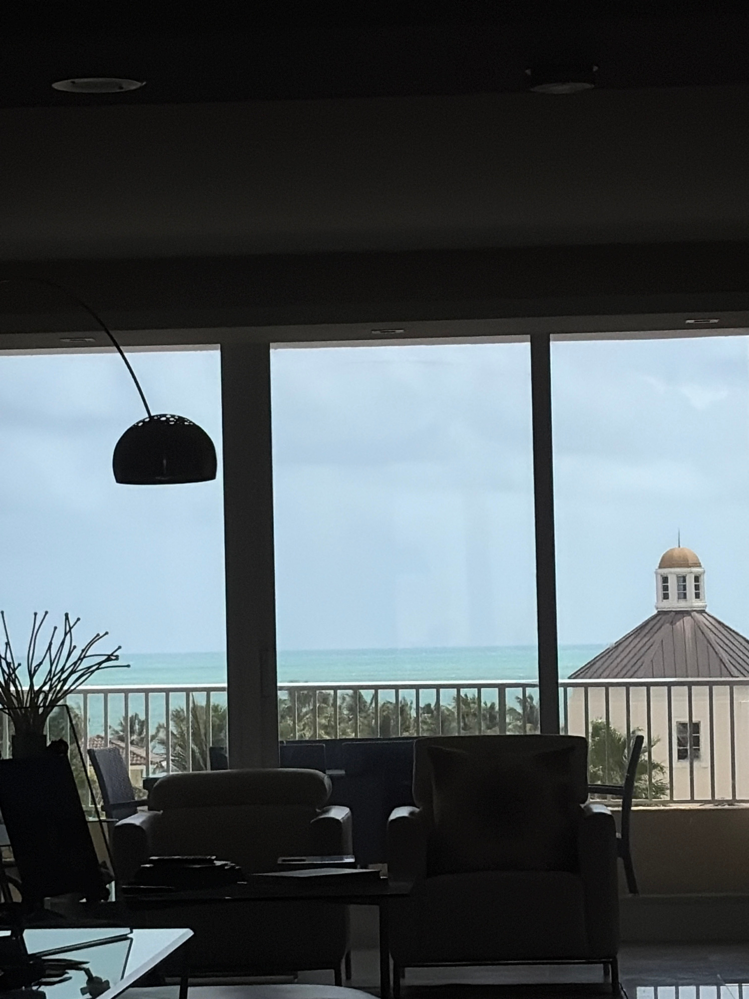 The image is taken from inside a building, looking out of a window towards what appears to be a beach and ocean view. A building with a dome on its roof is visible in the distance. The view outside thβ¦read more