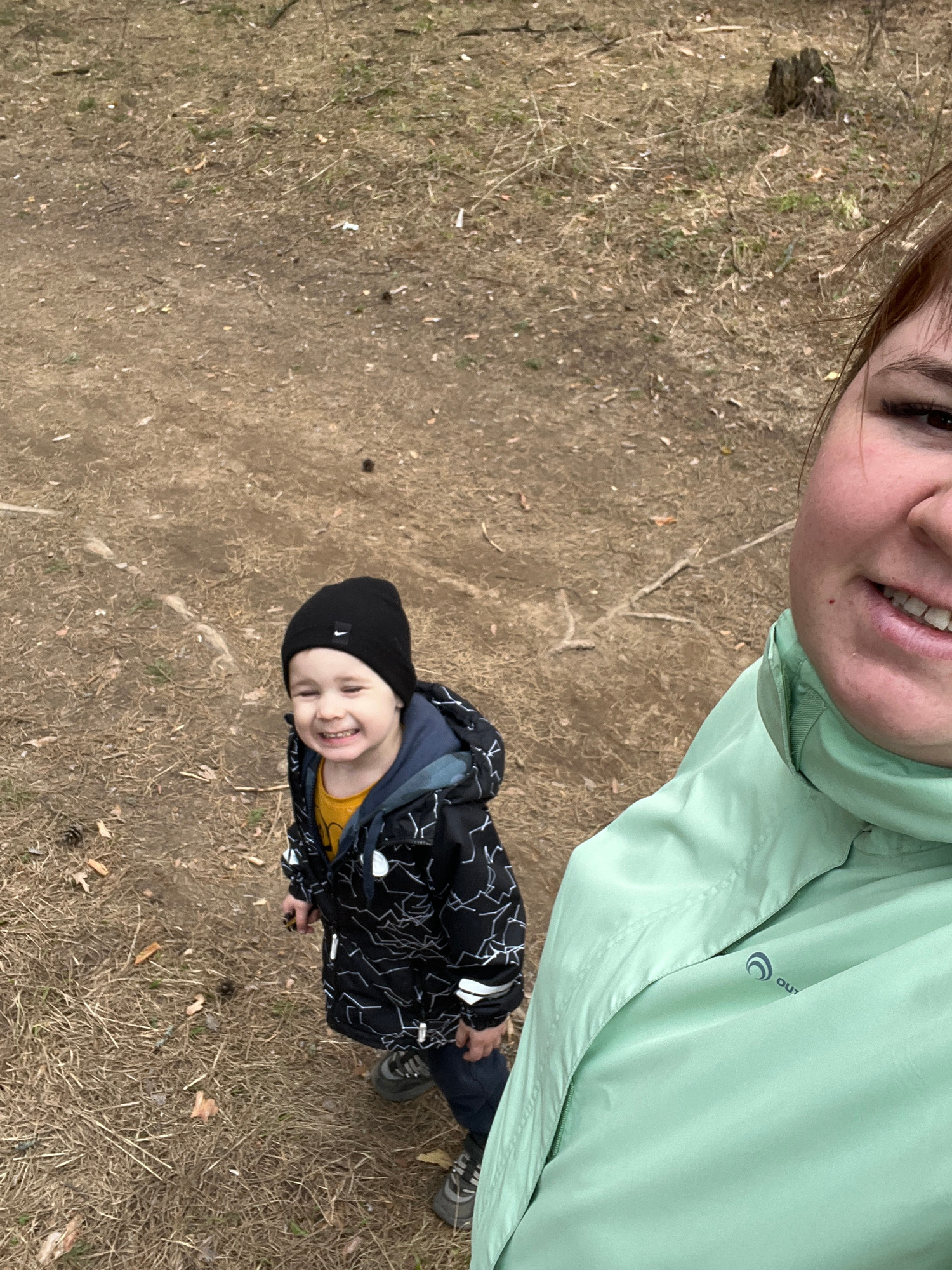 This overhead selfie-style photograph captures an adult and a young child outdoors, rotated on its side. The adult's face, smiling widely, occupies the top right portion of the frame, partially obscur…read more