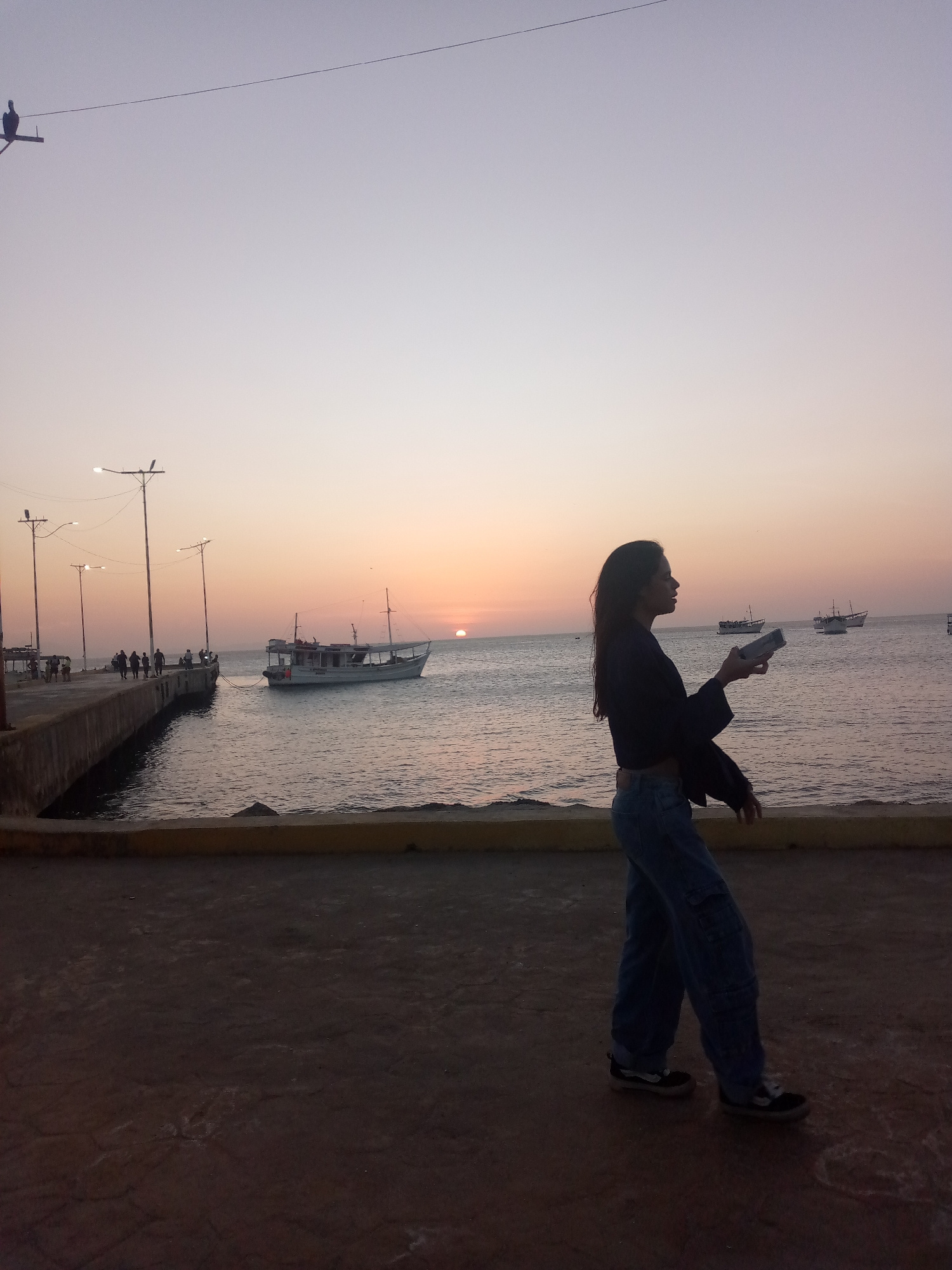 A young woman stands facing the sea at dusk in Juan Griego, Venezuela. She is holding a rectangular object, possibly a phone, in her hands. The sky is a pale gradient of colors, with the sun setting o…read more