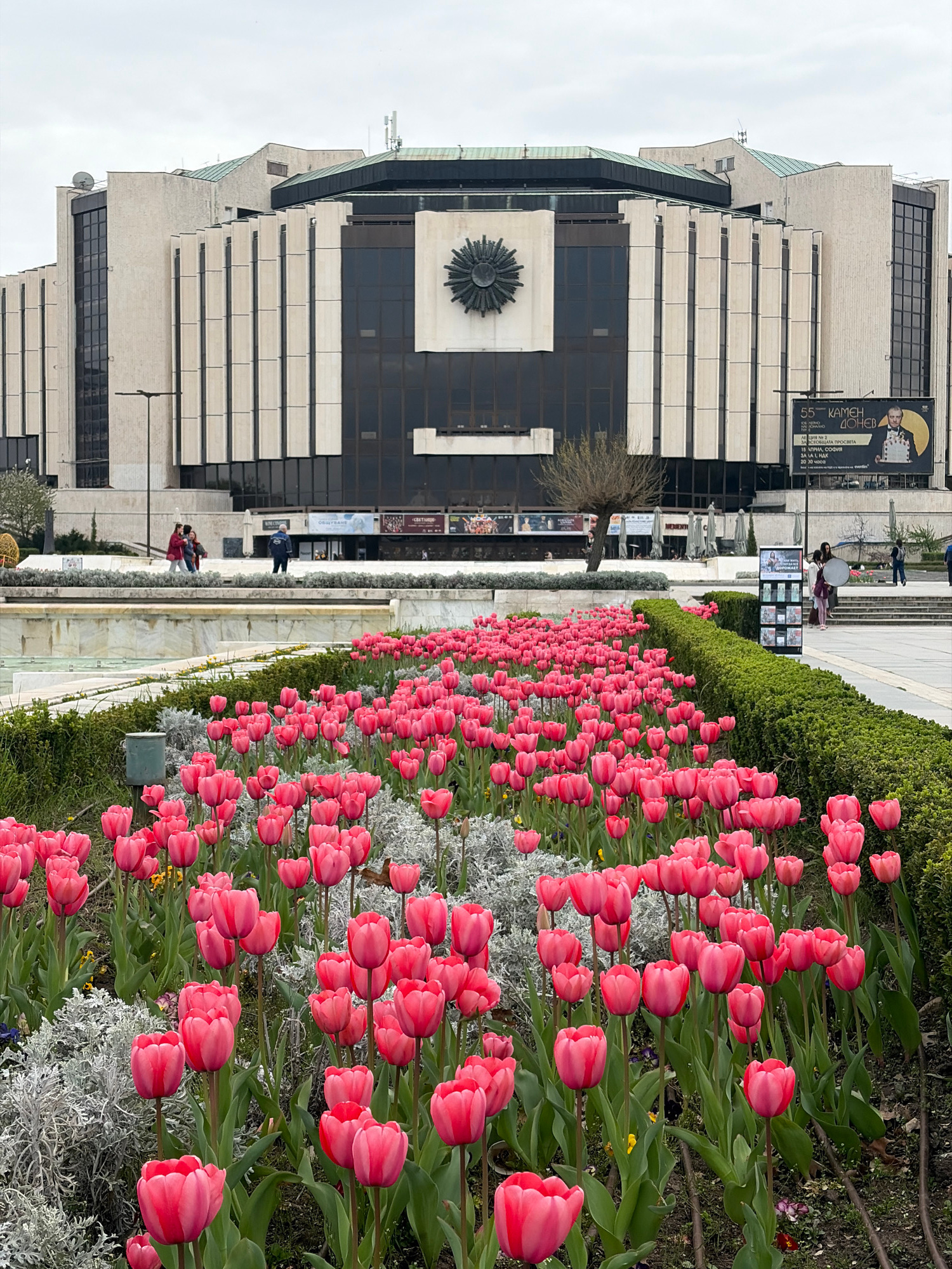 An outdoor vertical shot captures a vibrant urban scene, likely in spring, with a focus on a long bed of pink tulips. The image is taken during the daytime under an overcast sky, providing soft, diffu…read more