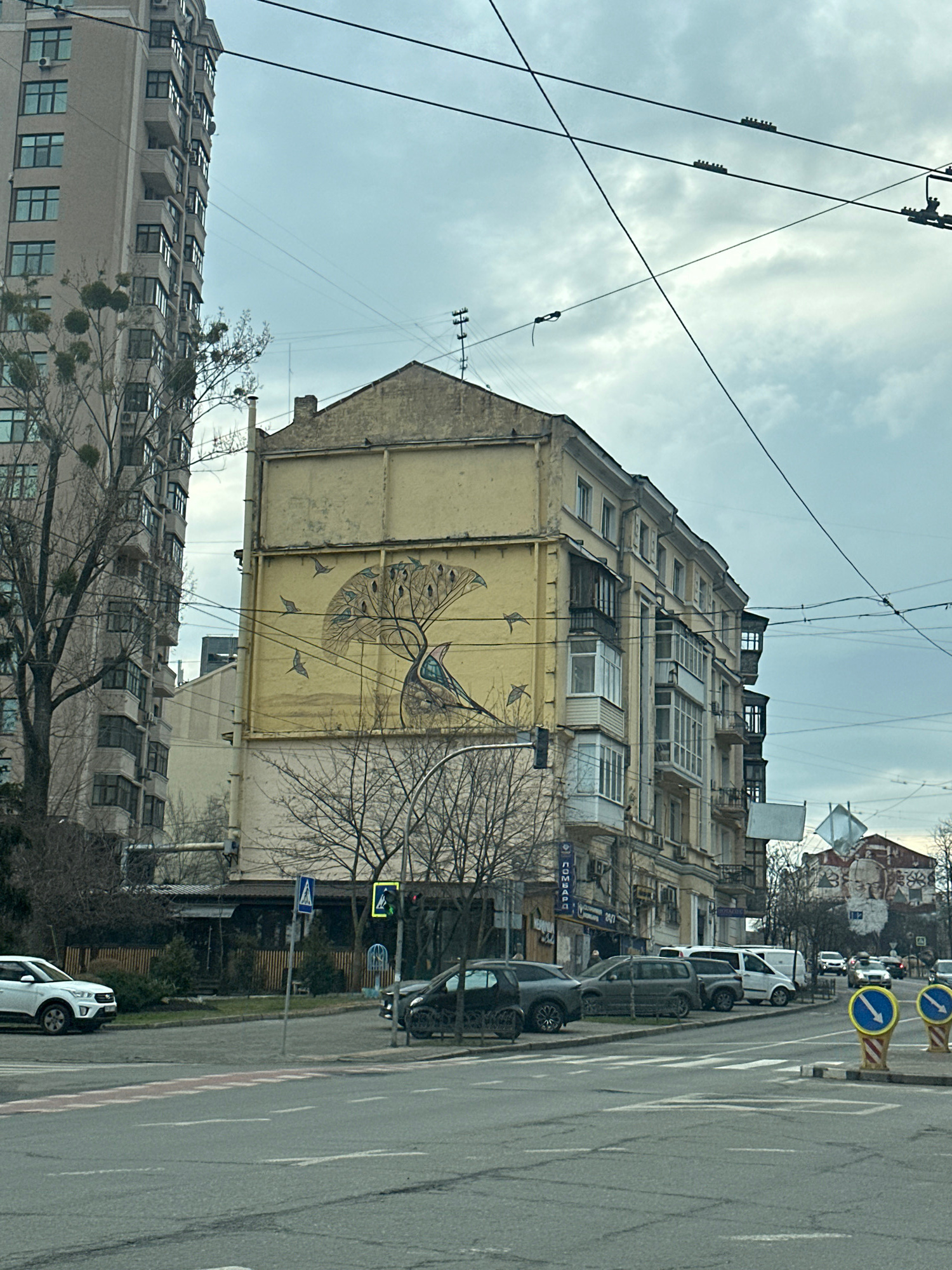 The image shows a street scene in Kyiv, Ukraine. The view is from a street level perspective, looking at a multi-story yellow building with a large mural of a bird on its side. Several other buildings…read more