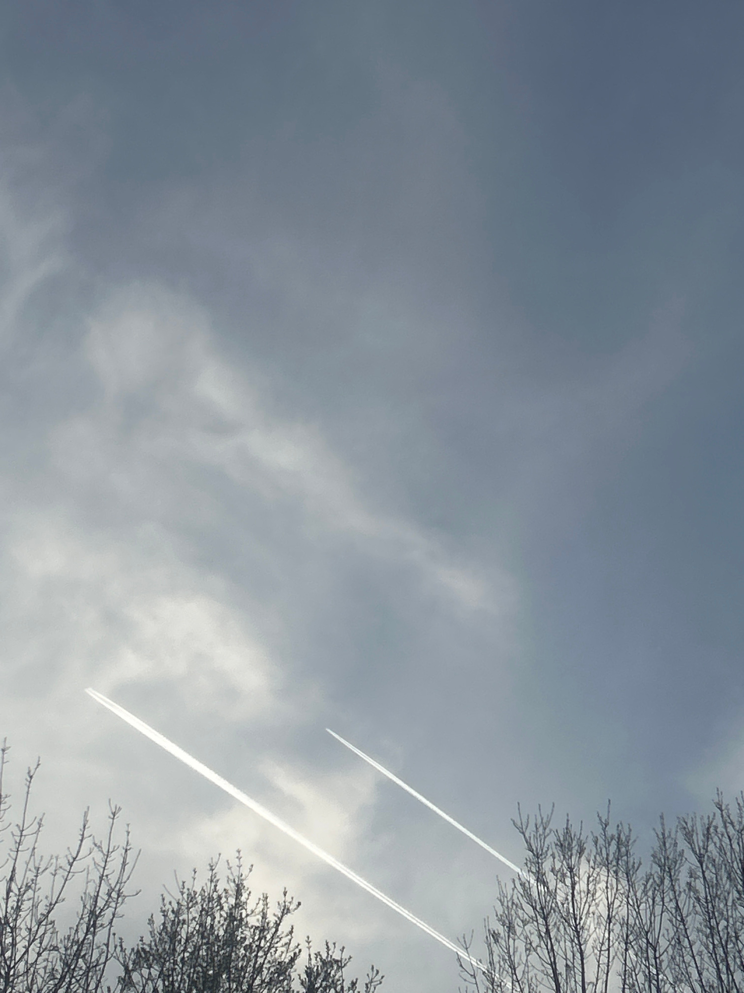 The image shows a gray sky with light clouds. Two contrails from airplanes are visible, extending from the center towards the upper right and lower right of the frame. Branches of trees, without leave…read more