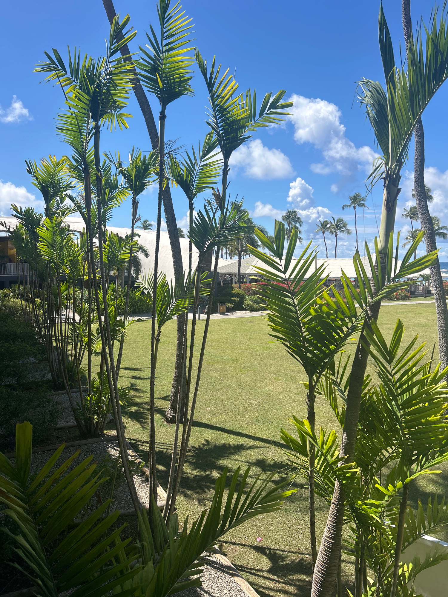 The image shows a tropical landscape, likely in Sainte-Anne, France, given the prompt. A green lawn occupies the center of the frame, bordered by a row of slender palm trees along the bottom edge. The…read more