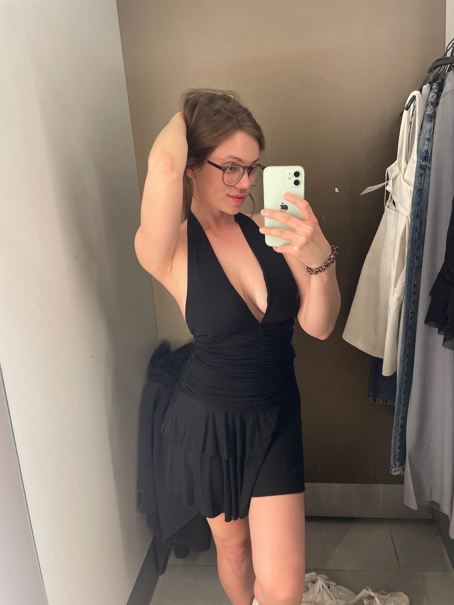 A woman with shoulder-length brown hair and glasses is taking a selfie in what appears to be a dressing room. She is wearing a short black dress with a V-neck. Her left hand is holding a smartphone, a…read more