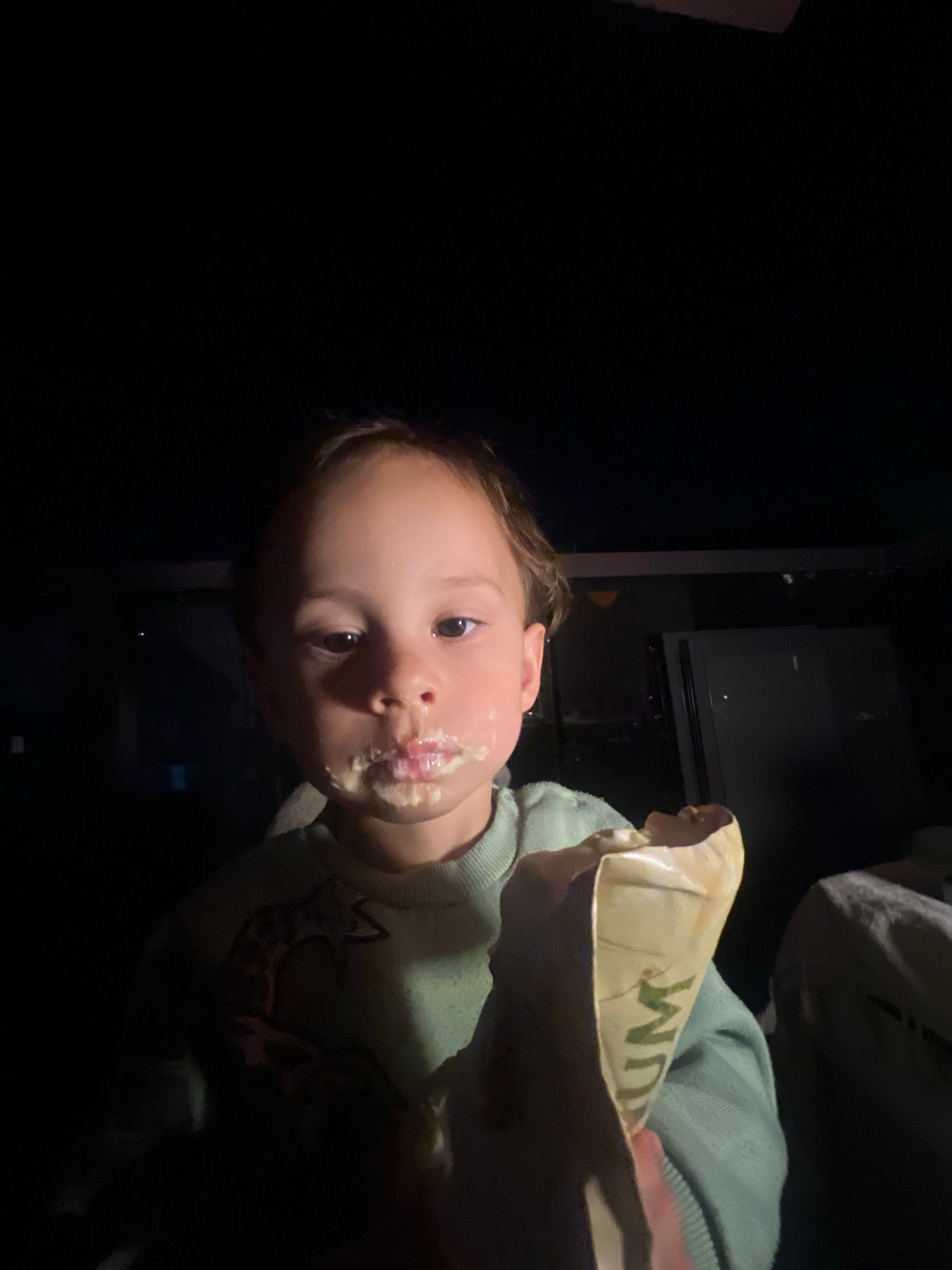 A young child, presumably a Caucasian girl, is holding an item wrapped in paper with the word "WUM" printed on it. The child's face is covered in what appears to be food residue. The environment is da…read more