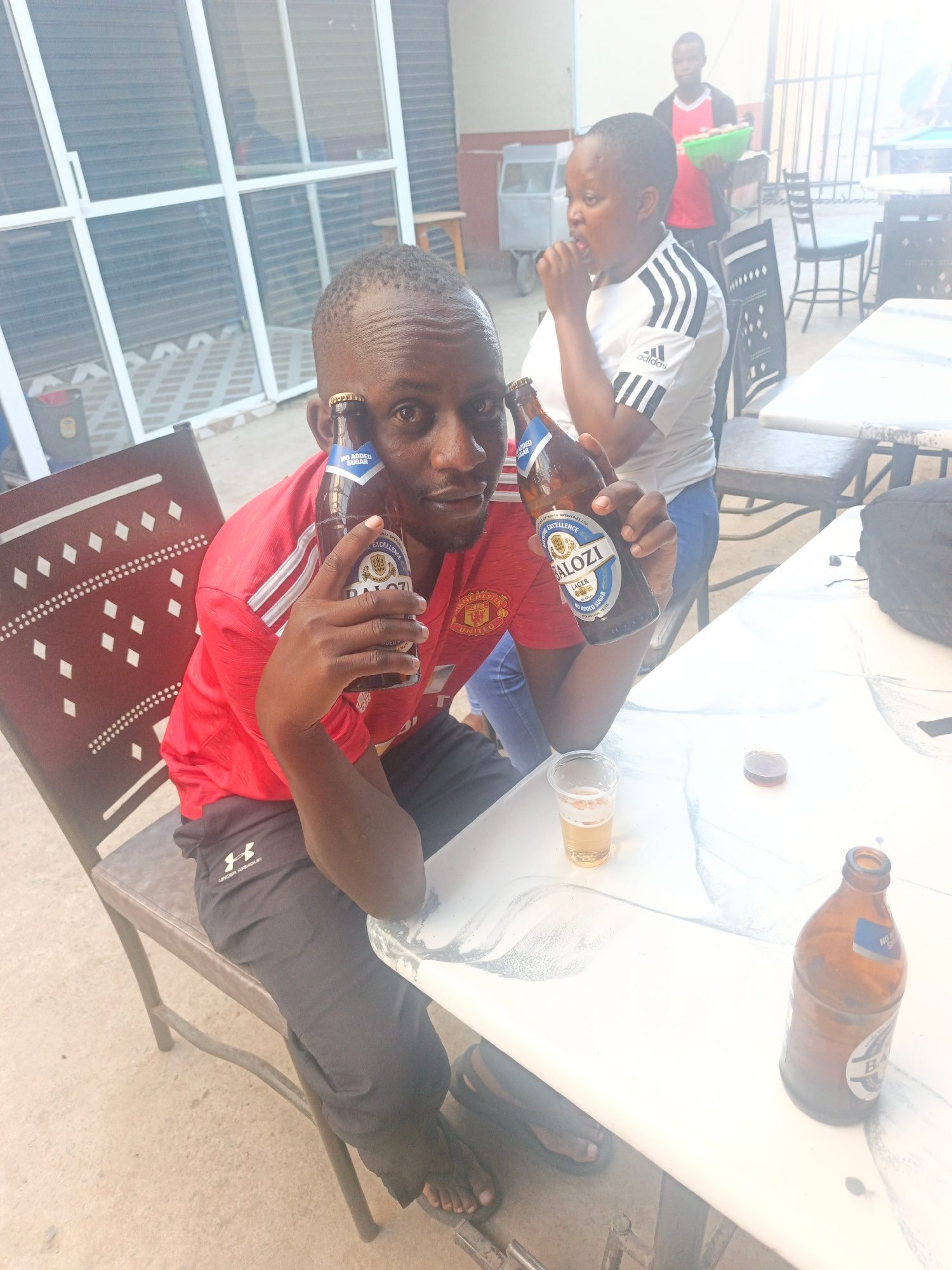 A man sits at a table outside, holding two bottles of Baloti beer. He is wearing a red Manchester United shirt and Under Armour pants. On the table is a plastic cup with beer and an empty beer bottle.…read more