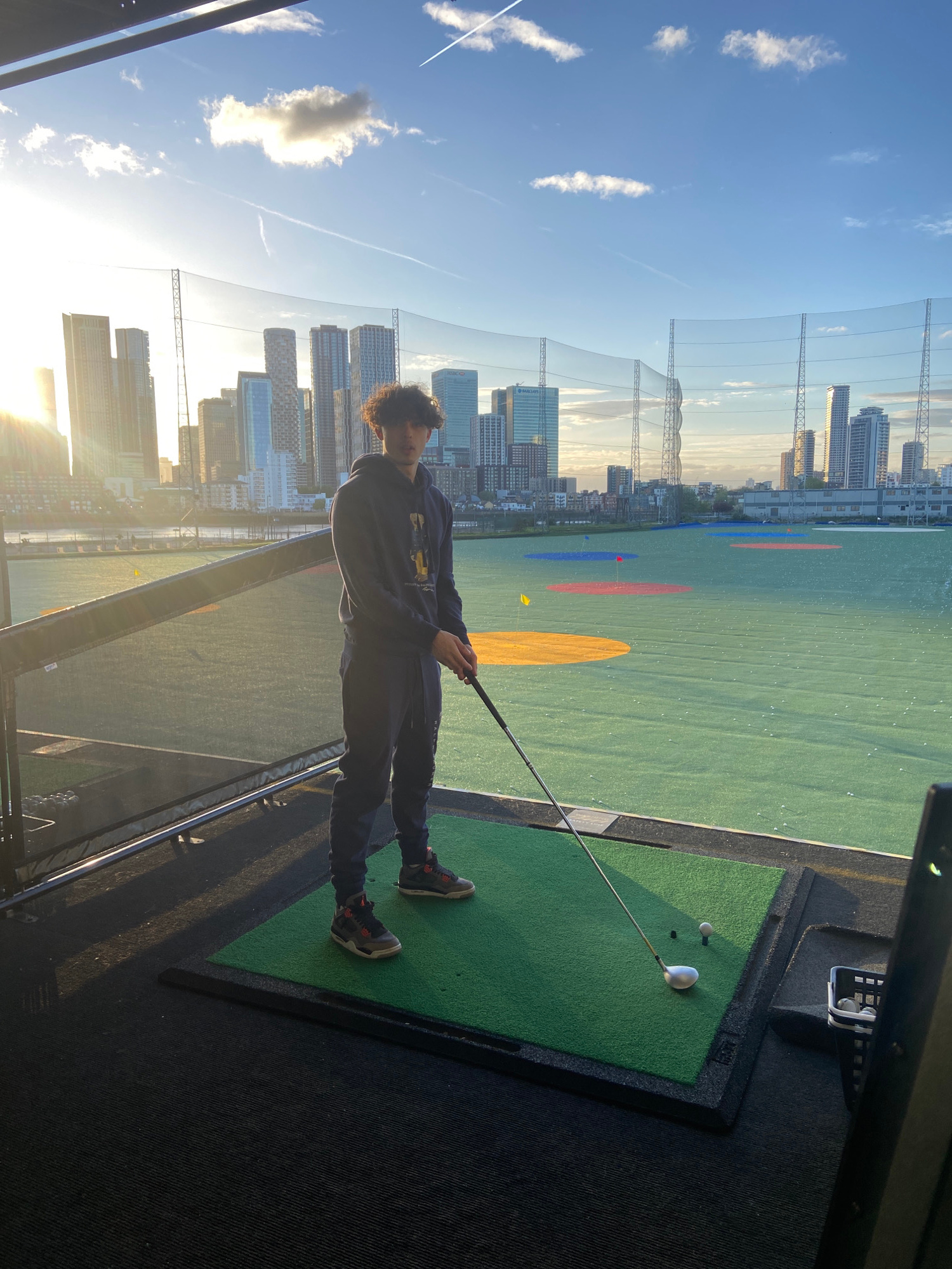 The image depicts a young man at an outdoor golf driving range, situated on an elevated platform overlooking a city skyline. He is positioned on a green artificial turf mat, holding a golf club, with…read more